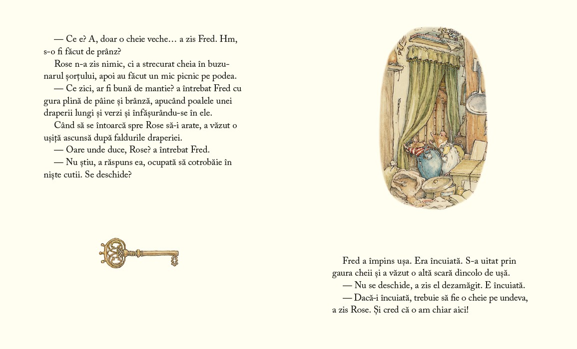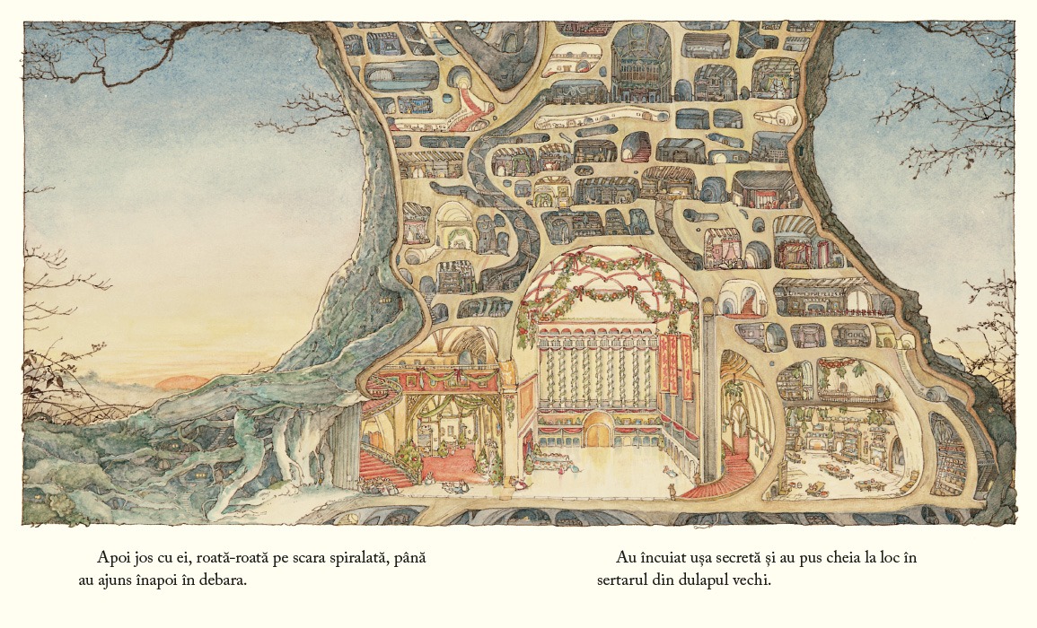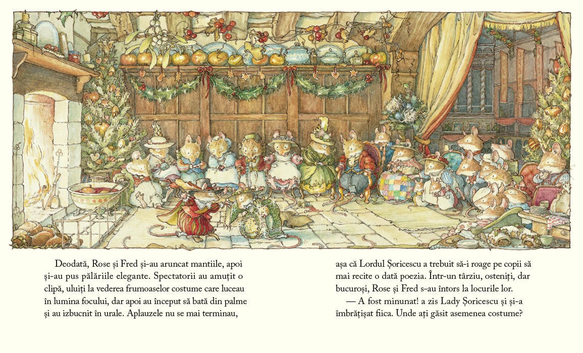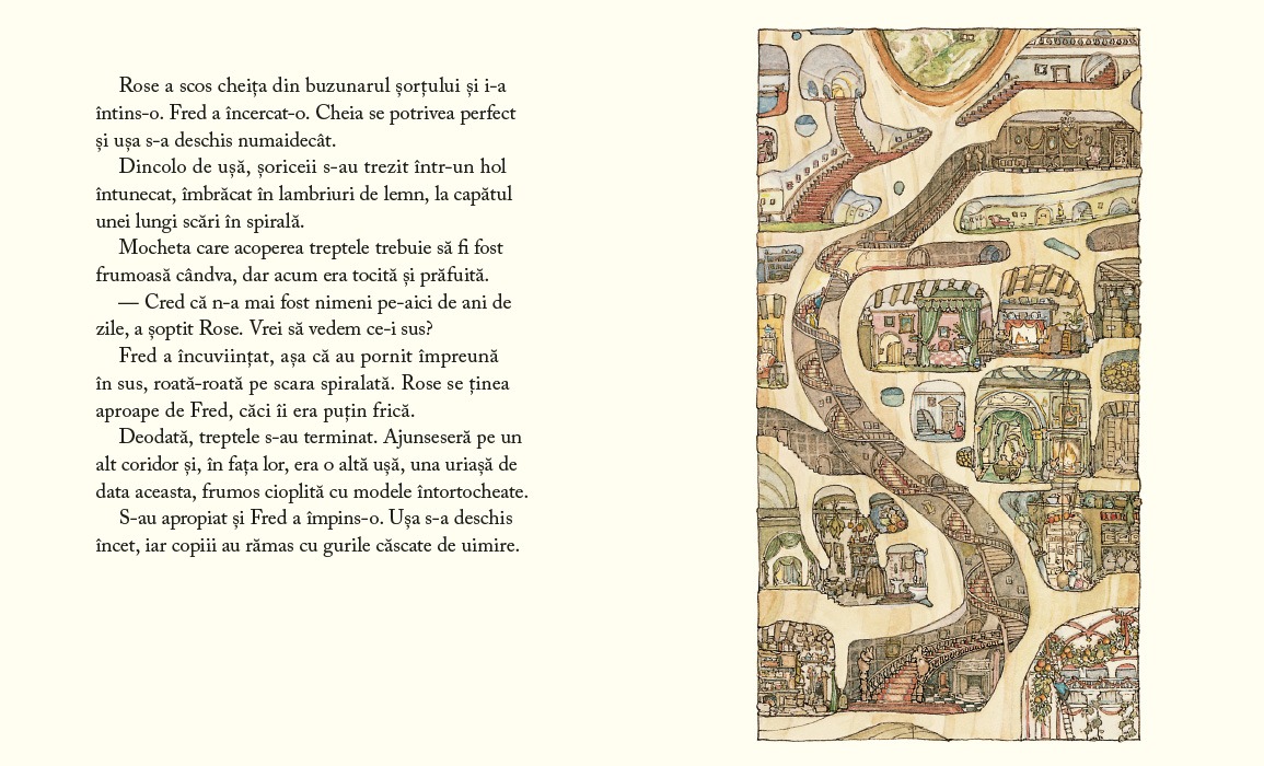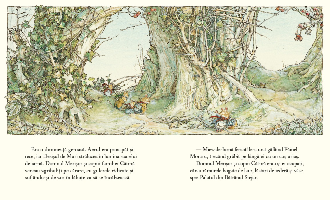 Scari secrete, chei ascunse, camere uitate de timp… si soricei pusi pe joaca In Desisul de Muri, miezul iernii e o data insemnata, ca in multe alte locuri din lume. Soriceii stiu ca de acum, de la solstitiu, chiar daca iarna e inca puternica, zilele incep sa creasca si noptile sa scada. E primul semn al luminii si caldurii care se vor intoarce curand, deci un prilej minunat pentru (inca) o petrecere. In vartejul pregatirilor, micutii Rose si Fred descopera in Palatul din Batranul Stejar o uimitoare scara secreta. Oare unde duce?Desisul de Muri este un crang spinos si incalcit care desparte campul de malul paraului. De multa vreme, in radacinile si trunchiurile copacilor de aici si-au facut casa cateva familii de soricei. Soriceii din Desisul de Muri sunt buni gospodari. Cand vremea e buna, aduna fructe de padure, nuci, alune si flori de pe campurile din jur, din care pregatesc dulceturi, muraturi si conserve, pastrate apoi la loc sigur in magazia din Buturuga pentru lunile de iarna.Soriceii sunt harnici si trebaluiesc incoace si-ncolo toata ziua, dar isi fac timp si pentru jocuri si petreceri. Fie ca e vorba de ziua unui soricel, fie de o nunta asteptata cu nerabdare sau doar de prima zi a unui nou anotimp, soriceii se bucura de orice prilej pentru a se intalni si a sarbatori impreuna cu mese intinse si voie buna.Desisul de Muri este lumea mea ideala. Soriceii mei traiesc in mijlocul naturii, sunt plini de iubire si grija unii fata de altii, iar tot ce creste in jur e frumos si folositor in multe feluri. Eu asa cred ca ar trebui sa fie viata. — Jill Barklem„Poveste de iarna“ este al cincilea volum din seria „Desisul de Muri“ (Brambly Hedge).