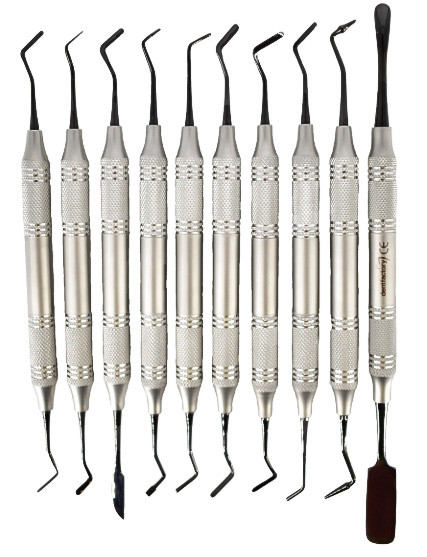 Set pentru modelat obturatii din compozit. Contine 10 piese, fiecare cate 2 varfuri special tratate pentru a reduce aderenta. In plus, culoarea varfurilor faciliteaza contrastul cu materialul de obturatie pentru o mai buna vizualizarea a acestuia. Nu reflecta deranjant lumina. Prezentare 10 instrumente din carbon pentru modelarea compozitului etui din piele ecologica
