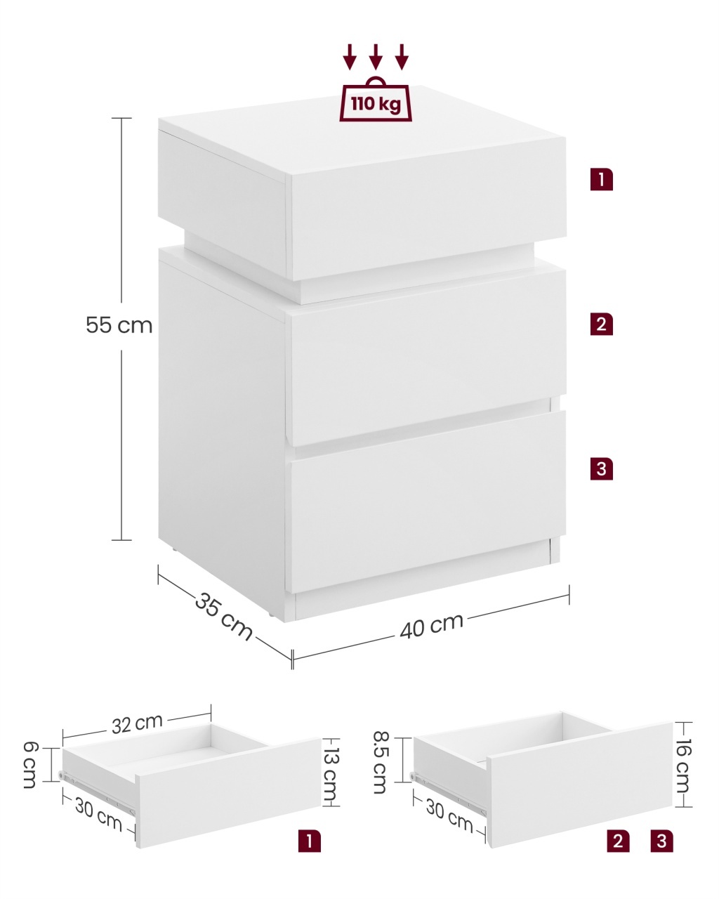 Set 2 buc. Noptiere Vasagle 40 x 35 x 55 cm — Ambianță personalizabilă și organizare rafinată Design modern și materiale de calitate Aceste noptiere îmbină o siluetă modernă cu o finisare în alb imaculat, oferind o prezență discretă care luminează și completează orice dormitor contemporan. Construcția din MDF și PAL de calitate asigură o suprafață netedă și o textură plăcută la atingere, conferind durabilitate și un aspect premium încă de la primul contact. Datorită liniilor simple și proporțiilor echilibrate, piesele aduc rafinament și o estetică coerentă în decorul tău. Funcționalitate și organizare Fiecare noptiere dispune de trei sertare generoase care transformă dezordinea în ordine, astfel încât revistele, telecomenzile și obiectele personale să aibă un loc bine definit; suprafața superioară rămâne liberă pentru ceasul deșteptător sau o lampă de citit. Iluminarea LED integrată, cu 25 de culori, 6 niveluri de luminozitate, 10 moduri de flash și 6 frecvențe de clipire, îți permite să creezi atmosfera dorită prin telecomanda inclusă, iar cablul lung de 1,8 m oferă versatilitate în poziționare, permițând amplasarea la distanță de prize. Prin organizare eficientă și soluții practice, noptierele optimizează spațiul și aduc un plus de spațios , organizare și versatilitate în fiecare încăpere. Montaj și întreținere Asamblarea se face rapid urmând instrucțiunile incluse, iar marcajele pentru piese simplifică pașii necesari; totuși, reține că manualul poate să nu fie în limba engleză, astfel încât puțină atenție suplimentară poate accelera montajul. Pentru întreținere recomandăm ștergerea cu o lavetă ușor umedă și evitarea substanțelor abrazive, ceea ce păstrează finisajul curat și menține durabilitate a produsului pe termen lung. Deși konstrukția este stabilă, vă sfătuim să folosiți fixarea în perete pentru un plus de siguranță și stabilitate, garantând astfel utilizarea în siguranță în locuință. Comandă acum Adaugă setul de noptiere în coș și transformă-ți dormitorul într-un spațiu organizat și plin de ambianță personalizată. Detalii tehnice complete Dimensiuni și greutate Dimensiuni produs: 40 x 35 x 55 cm Greutate produs: 26 kg Capacitate maximă: 110 kg Materiale și caracteristici Material corp: MDF și PAL Culoare: Alb Sarcină maximă sertar superior: 2,3 kg Sarcină maximă sertare inferioare: 3,4 kg Montaj și pachet Stare asamblare: Neasamblat Conținut pachet: 2 x Noptiere, 2 x Accesorii de montaj, 2 x Instrucțiuni Stil și origine Stil: Modern Destinație recomandată: Dormitor, Living, Birou