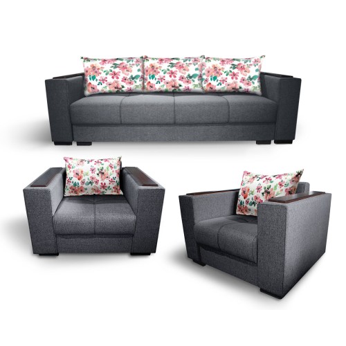 Setul 3+1+1 Solis este alcatuit dintr-o canapea cu 3 locuri si 2 fotolii fixe. Canapeaua Solis este o canapea moderna conceputa pentru un stil de viata activ fiind foarte usor de extins si de strans. Canapeaua Solis este extensibila putand fi utilizata zilnic atat ca si canapea pentru petrecerea timpului liber cat si ca un pat generos pe timpul noptii. Suprafata de dormit este 140 * 190 cm. Canapeaua Solis are saltele cu plasa de arcuri (tip Relaxa) si burete de densitate mare pentru o rezistenta sporita in timp, iar datorita suprafetei plane care se formeaza atunci cand se extinde asigura un somn odihnitor pe timpul noptii. Atat canapeaua cat si pernele sunt tapitate cu stofa. Canapeaua Solis are o lada de depozitare generoasa foarte practica atat pentru lenjeria de pat, cat si pentru diverse obiecte pe care le folositi rar. Sezutul in varianta stransa are o latime generoasa de 70 cm si poate fi folosit de o persoana in timpul zilei pentru un pui de somn fara a mai fi nevoie sa extindeti canapeaua. Canapeaua Solis are 3 perne pufoase foarte utile pentru o sedere cat mai confortabila pe canapea, dar si pentru o pata de culoare. Canapeaua Solis este foarte usor de montat avand elemente de cuplare rapide. Canapeaua Solis este prevazuta cu un peretar prins intre brate care ramane la perete atunci cand canapeaua este extinsa si este folosita pentru dormit. Peretarul protejeaza peretele si asigura un confort sporit pentru persoana care va dormi la perete. Cusaturile de pe sezutul canapelei dau o eleganta aparte canapelei Solis. Pe bratele canapelei se afla ornamente din MDF wenge care pot fi folosite ca suport pentru pahare. Dimensiuni canapea Solis stransa: Lungime: 2320 mm Adancime: 990 mm Inaltime: 710 mm Suprafata de dormitor canapea Solis: 1400 x 1900 mm Fotoliul Solis este un fotoliu modern conceput pentru un stil de viata activ. Fotoliul Solis are saltea cu plasa de arcuri (tip Relaxa) si burete de densitate mare pentru o rezistenta sporita in timp. Atat fotoliul cat si perna sunt tapitate cu stofa. Fotoliul Solis are o perna pufoasa foarte utila pentru o sedere cat mai confortabila pe fotoliu, dar si pentru o pata de culoare. Cusaturile de pe sezutul fotoliului dau o eleganta aparte produsului. Pe bratele fotoliului se afla ornamente din MDF wenge care pot fi folosite ca suport pentru pahare. Fotoliul Solis este foarte usor de montat avand elemente de cuplare rapide. Dimensiuni fotoliu Solis: Lungime: 1080 mm Adancime: 860 mm Inaltime: 730 mm