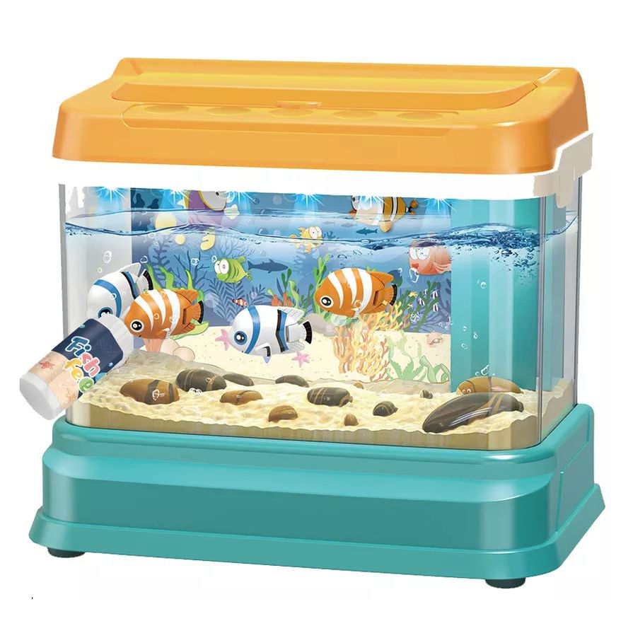 Set Acvariu interactiv cu Lumini si Sunete, Pestisori si Undite Magnetice, pentru copii, Salamandra Kids/n /n/nDorintele copiilor sunt mereu diversificate. Parintii isi cunosc cel mai bine copiii, asa ca uneori dorinta de a avea un pestisor adevarat poate fi testata cu ajutorul unor jucarii interactive./nExemplul cel mai potrivit pentru un copilas care isi doreste un acvariu este cel al acestei jucarii./nApa il va ajuta pe copil sa aiba experienta reala de care are nevoie. Luminile, la fel, vor simula experienta unui acvariu adevarat. /n/nSetul cuprinde:/n1 x Acvariu cu sistem de filtrare a apei/n2 x Pestisori cu inotatoare miscatoare/n2 x Undite cu magnet/n1 x Recipient hrana cu magnet/n1 x Plasa pentru pestisori/n1 x Cablu USB/n/nAtunci cand este activat butonul ON/OFF in partea dreapta se aprind luminile. Atunci incepe sa functioneze si sistemul de circulare a apei. Puteti activa si cantecele linistitoare ce se aud pe fundal daca mutati butonul spre stanga, pana in capat. Atunci cand setati butonul pe mijloc este selectat OFF. Mutarea butonului in stanga sau dreapta schimba functiile jucariei. /nJocul stimuleaza interactiunea parinte-copil. Cu unditele trebuie sa va apropiati de gura pestisorilor astfel incat sa ii puteti captura./n/nCand pestisorul de afla aproape de marginile acvariului, cu ajutorul recipientului de hranire lipit de geamul acvariului puteti sa mutati sus-jos sau stanga-dreapta pestisorul./n Cand copilul doreste sa pescuiasca trebuie indepartat capacul acvariului. /n Dimensiunile acvariului sunt de:/n/nInaltime: 18 cm/n/n/nLungime: 19 cm/n/n/nLatime: 11.5 cm/n/n Produsul este ambalat intr-o cutie proprie cu dimensiunile de:/n/nLungime – 27.5 cm/n/n/nLatime – 12.5 cm/n/n/nInaltime – 22.5 cm/n/n/n/nJucaria functioneaza cu ajutorul unui cablu USB ce poate fi conectat atat la un PC, cat si la un adaptor pentru priza. Poate fi lasat in priza atunci cand nu este utilizat astfel incat sa creeze o lumina placuta in camera./nRecomandam ca atunci cand copilul se joaca in apa (cand pescuieste) sa deconectati capacul jucariei de la incarcare./nRecomandat copiilor de peste 3 ani.