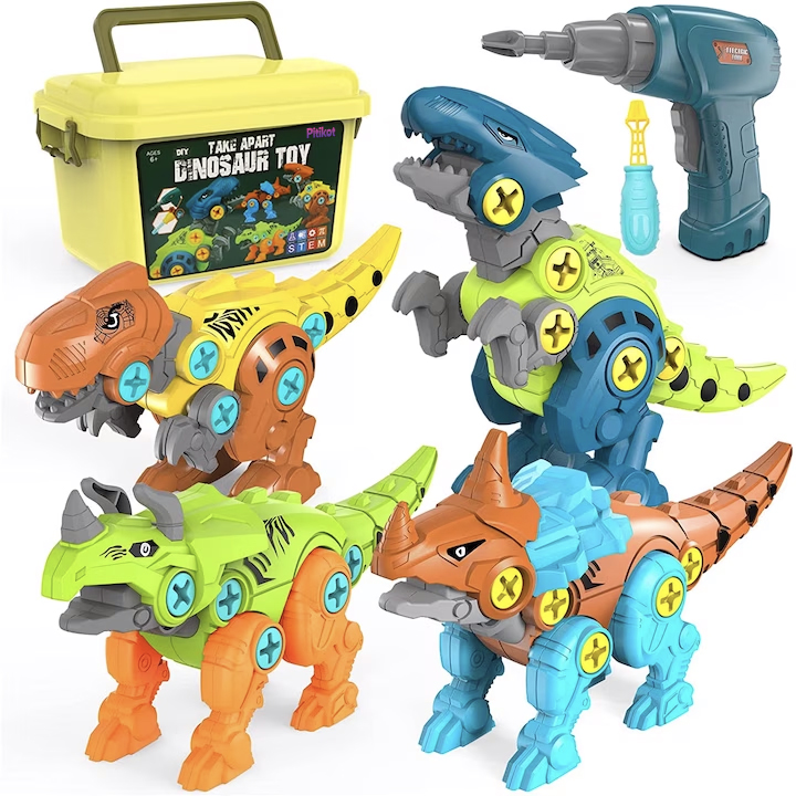 Acest set de jucarii de constructie include Tyrannosaurus Rex, Centrosaurus, Triceratops si Velociraptor, 1 surubelnita si 1 burghiu electric. Partile de dinozaur pot fi asamblate si amestecate de catre copiii insisi, ceea ce le sporeste imaginatia si creativitatea in timp ce isi construiesc proprii dinozauri si isi exerseaza constant abilitatile. Modul de instalare poate fi manual cu ajutorul surubelnitei si electric cu autofiletanta. Cele doua moduri diferite de asamblare ofera diversitate si contribuie la procesul de invatare intr-un mod mai interesant si eficient. Autofiletanta functioneaza ca una adevarata, iar atunci cand surubul este strans, se va opri automat. Viteza masinii de gaurit electrica este foarte lenta, fiind astfel foarte sigura in mainile copiilor. Pentru a putea fi folosita, surubelnita electrica, are nevoie de doua baterii AAA ce nu sunt neincluse in pachet. Articulatiile dinozaurilor sunt mobile, iar fiecare pozitie este insotita si confirmata de sunete de clic. Capul, gura, membrele si coada sunt flexibile si pot fi pozitionate pentru a balansa corpul, formand diverse forme sau ipostaze de lupta. Jucaria le permite copiilor sa recunoasca si sa exploreze o noua lume pentru ei, cea a dinozaurilor. Toate articolele sunt ambalate intr-o cutie portabila de depozitare. Cutia este foarte la indemana pentru vizitele si joaca la prieteni, facilitand transportul. De asemenea, atunci cand joaca s-a terminat, ii ajuta pe copii sa stranga piesele in cutie dezvoltand obiceiuri de organizare si ingrijire inca de la o varsta frageda. Acest set de dinozauri demontabili sunt o jucarie educationala ce poate imbunatati in mod eficient coordonarea ochi-mana, capacitatea de manipulare, abilitatile de logica si abilitatile de lucru in echipa. Toate piesele din set sunt fabricate din material plastic ecologic, sigur si durabil, proiectate pentru copii, fara puncte ascutite sau colturi, cu margini netede si rotunjite ce ofera siguranta copiilor in timpul jocului. Pot rezista la cazaturi, sunt rezistente la uzura, nu ruginesc, fapt ce ofera o utilitate pentru o lunga perioada de timp. Setul nostru de jucarii, este un cadou excelent pentru invatare pentru copiii, in special pentru baieti. Este o modalitate buna de a incepe educatia timpurie pentru a dezvolta creativitatea si abilitatile practice. De asemenea, poate ajuta la construirea unei relatii puternice intre parinti si copii.