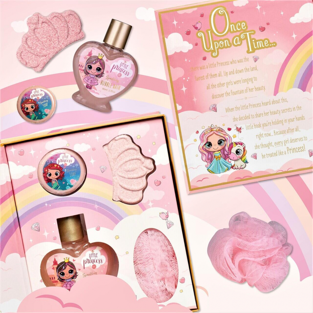 Set cadou Little Princess - 4 produse pentru baie cu aroma de capsuni si cheescake, care impresioneaza atat prin spuma parfumata cat si prin prezentarea sub forma de carte de povesti, ce poate fi folo