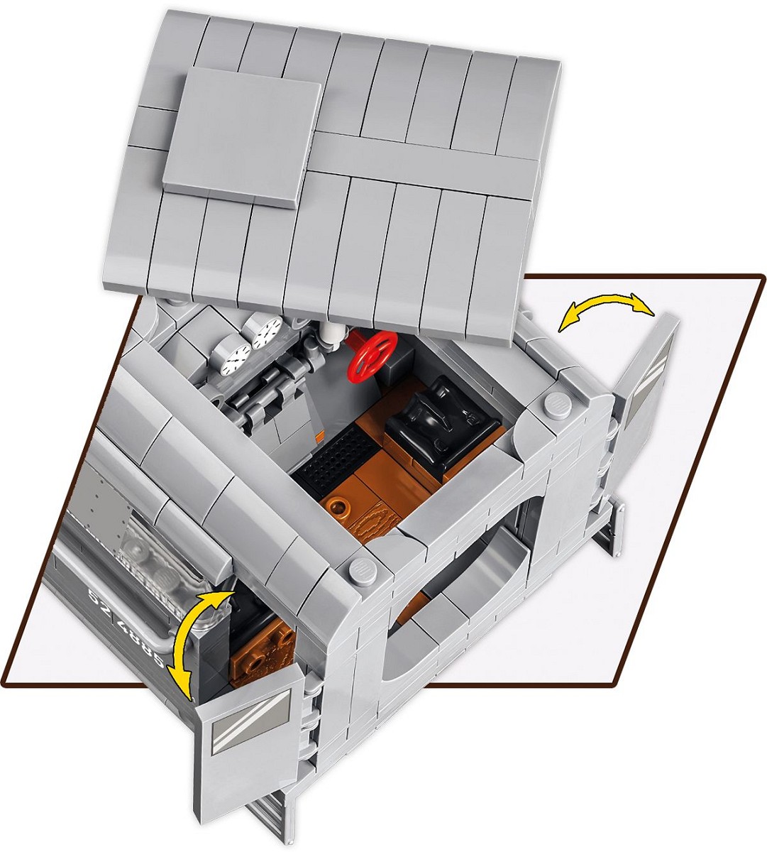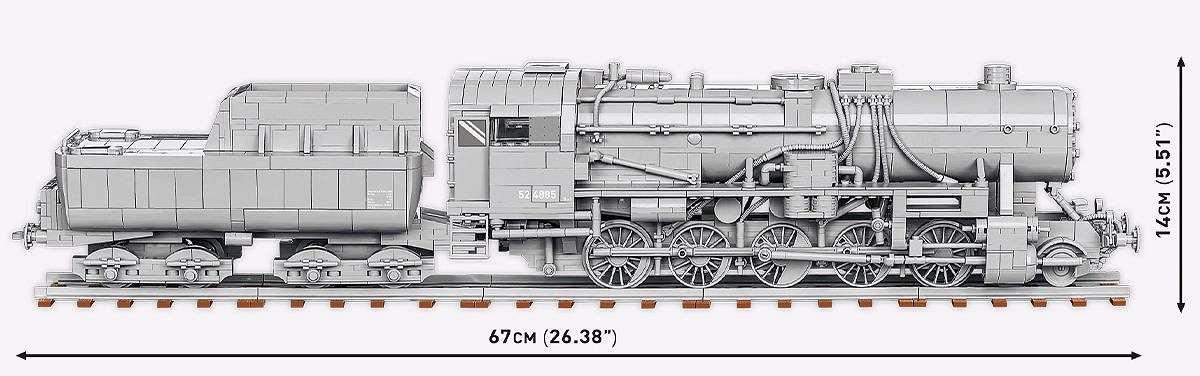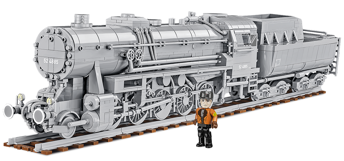 Set de constructie locomotiva cu abur Kriegslokomotive Baureihe 52 din al Doilea Razboi Mondial face parte din noua colectie „Trenuri” din catalogul COBI. Designul blocului reproduce cu fidelitate caroseria, proportiile si detaliile legendarei locomotive cu abur, care este probabil cea mai populara si cea mai recunoscuta pentru toate vehiculele feroviare din lume.Camuflajul unic al vehiculului atrage cu siguranta atentia. Locomotiva este lansata intr-o culoare gri care corespunde picturii locomotivelor militare germane de pe Frontul de Est in timpul invaziei germane a Uniunii Sovietice. Setul include si o figura speciala a unui mecanic de tren militar german. Modelul de locomotiva a fost proiectat la scara 1:35 si prezinta numeroase detalii precum simboluri, numerotare, marcaje si numeroase imprimeuri in interiorul salii masinilor locomotivei. Datorita acoperisului usor demontabil al salii masinilor, puteti privi inauntru pentru a vedea detaliile reproduse cu fidelitate ale dispozitivelor si instrumentelor folosite pentru a conduce vehiculul. Puteti vedea chiar carbune arzand in cutia de foc!Ca si in cazul unei locomotive cu abur adevarate, intregul motor si tenderul sunt cuplate impreuna in asa fel incat sa se miste simultan. In interiorul modelului exista angrenaje care formeaza un mecanism complex care asigura o miscare realista a rotilor si a intregii tractiuni. Doar impingeti usor modelul pentru a muta intreaga locomotiva.Cinci modele diferite de roti din locomotiva fac ca modelul sa se aseze perfect pe sine de bloc si sa poata, de asemenea, sa negocieze viraj. Este de remarcat faptul ca modelul este, de asemenea, pe deplin compatibil cu sinele de blocare ale altor marci de blocuri.De asemenea, compania COBI a produs propria forma de bloc recreand o sectiune a pistei. Setul include cinci astfel de sectiuni cu o lungime totala de aproximativ 65 cm. Piesa este realizata cu tehnologia moderna de injectie in doua culori, ceea ce inseamna ca fiecare sectiune este realizata din doua culori diferite de plastic care sunt conectate intre ele. Sinele de culoarea otelului gri se evidentiaza in mod clar de legaturile de cale ferata maro foarte realiste. Pe fiecare cravata nu sunt vizibile stifturi, ceea ce le imbunatateste realismul, iar fiecare dintre ele este acoperita cu o textura de scandura, o imitatie a granulelor lemnului. Senile pot fi atasate de placi bloc si au o gaura fizica, datorita careia puteti atasa permanent senila la orice afisaj pe care il creati. Acest set este cadoul perfect pentru orice pasionat de istorie si cale ferata. Construieste istorie, bucata cu bucata, cu COBI!BR 52 a fost o locomotiva cu abur de marfa construita in Germania, produsa in multe fabrici europene intre 1942 si 1945. Era o locomotiva cu abur foarte ieftina, simpla, dar foarte fiabila. Locomotiva era capabila sa traga trenuri de marfa cu o greutate totala de pana la 620 de tone la o viteza de 80 km/h sau 1.700 de tone la o viteza de 50 km/h. Locomotiva a fost folosita de multe ori si pentru a transporta trenuri de calatori.Scara: 1:35Numar figurine: 1Dimensiuni model: 69 x 9.5 x 14 cm