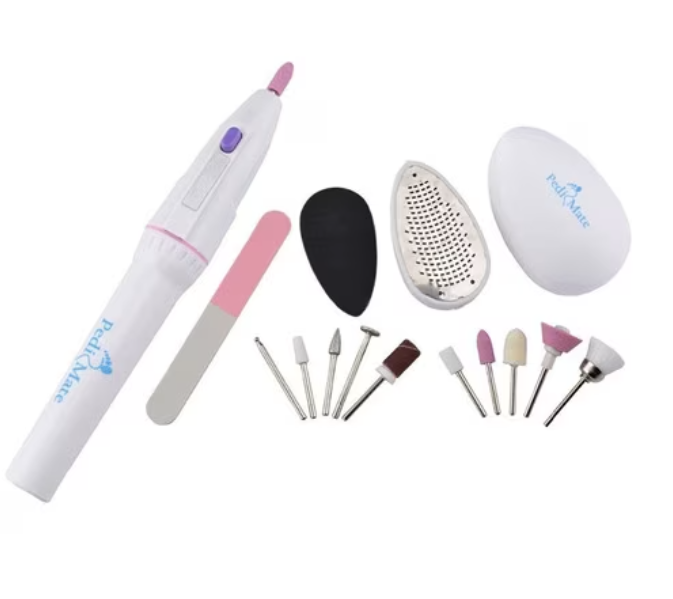 Setul de manichiură-pedichiură este un kit complet, ce conține 18 accesorii indispensabile pentru îngrijirea și frumusețea unghiilor tale. Fie că vrei să-ți faci o manichiură perfectă sau să ai picioarele îngrijite și frumoase, acest set îți oferă instrumentele necesare pentru a obține rezultate profesionale în confortul casei tale. Cu ajutorul setului de manichiură-pedichiură, poți realiza diverse etape ale procesului de îngrijire a unghiilor, cum ar fi tăierea, pilirea, îndepărtarea cuticulelor și pielii îngroșate, lustruirea și aplicarea lacului de unghii. Ai tot ce ai nevoie pentru a-ți crea un aspect impecabil al unghiilor, indiferent de preferințele și stilul tău. Setul este compact și ușor de transportat, astfel încât îl poți lua cu tine în călătorii sau în vacanțe, asigurându-ți că unghiile tale arată întotdeauna bine. Este important să respecți instrucțiunile de utilizare și să fii precaut în timpul utilizării instrumentelor din set, pentru a evita rănirea sau deteriorarea unghiilor sau a pielii. Asigură-te că păstrezi setul într-un loc sigur și uscat, pentru a-i menține calitatea și funcționalitatea pe termen lung. Set manichiura/pedichiura 18 piese. Aveti la dispozitie 2 pile ergonomice special create pentru a indeparta pielea moarta, un aparat electric, 10 capete pentru un netezire si finisare a unghiilor, o pila pentru unghii si inca 4 accesorii ce pot fi folosite pentru netezirea ulterioara a calcaielor si a restului labei piciorului. Utilizare: Piele uscata si crapata pe calcaie; Pielea aspra si bataturile de pe degetul mare si partea laterala a talpii; Unghii cu forme neregulate, cuticule sau asperitati. Continut pachet: 2 x pile ergonomice Pedi Mate pentru ingrijirea calcaielor; 1 x pila lunga pentru ingrijirea unghiilor; 10 accesorii pentru aparatul Pedi Mate; 4 x accesorii cu suprafata usor abraziva pentru netezirea calcaielor.