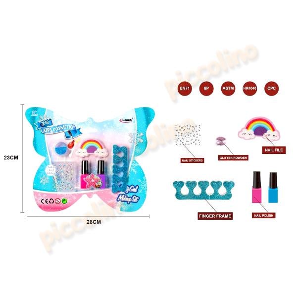 Set cosmetic cu oje pila abtibilduri separator degete pudra sclipiciSpalati cu apa din abundenta daca apar reactii alergice Produs non-toxic si testat dermatologic Data expirare mar2026 Dupa deschidere folositi produsul timp de maxim 6 luni Depozitati in loc ferit de razele soarelui si umiditate la maxim 25 de grade Celsius