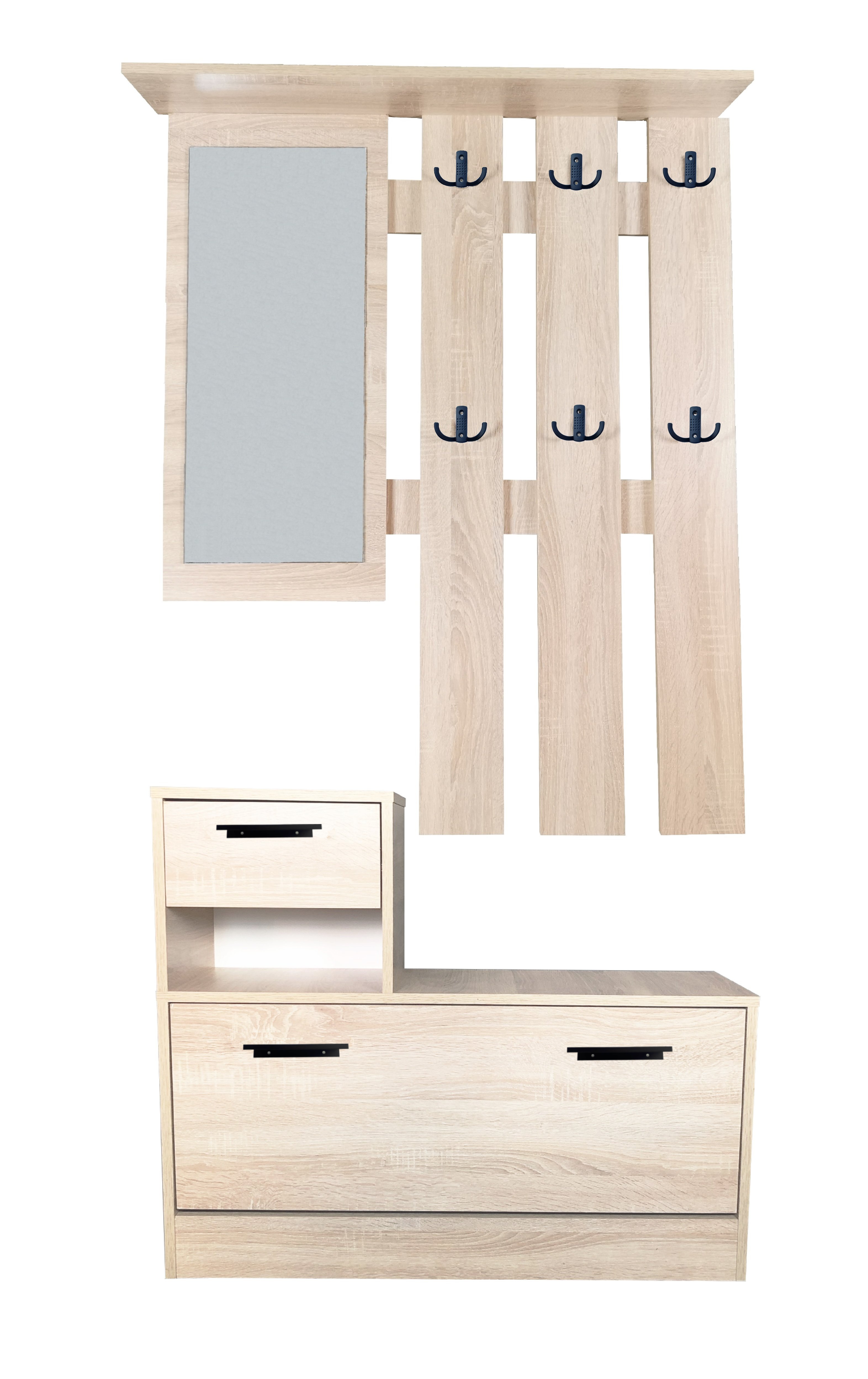Setul de mobilier pentru hol, Filio este format din doua parti care servesc diferitelor nevoi de organizare a articolelor de imbracaminte si incaltaminte. Partea superioara este deschisa, se ataseaza de perete si este prevazuta cu oglinda, agatatori si o polita de dimensiuni reduse. Partea inferioara este inchisa si este extrem de utila pentru depozitarea pantofilor. Mai mult decat atat, cele doua rafturi de dimensiuni mai mici construiesc un spatiu ideal pentru articole de decor sau obiecte indragite, pentru a conferi personalitate spatiului in care pasiti prima data in locuinta.Datorita designului, cuierul Filio dispune de functionalitatea unui cuier, a unei comode, a unei noptiere si a unei oglinzi, elemente care sunt prezente intr-un singur produs.Oglinda integrata, are latimea de 28 cm si inaltimea de 68 cm, si este un element de modernitate, care confera iluzia unui spatiu de dimensiuni mai mari, lumineaza holul si este mereu la indemana pentru a potrivi esarfa, palaria sau pantofii cu tinuta aleasa. Raftul superior, cel inferior, raftul lateral si sertarul lateral permit asezarea organizata a accesoriilor vestimentare, astfel incat sa le gasiti rapid si sa dispuneti de suficient spatiu pentru acestea. Cuierul este prevazut cu un numar total de 12 agatatori.Setul de mobilier pentru hol, Filio este realizat din PAL finisat cu melamina. Usa se deschide cu ajutorul unui sistem batant, in partea inferioara, iar interiorul este organizat cu doua rafturi pentru incaltaminte, fiecare raft avand capacitatea de a depozita 3 perechi de pantofi. Dimensiunile acestuia sunt 90 cm latime, 191 cm inaltime si 24 cm adancime, ideale pentru a utiliza la maximum si intr-un mod eficient spatiul disponibil din hol. Inaltimea este cea recomandata, intrucat partea superioara a cuierului poate fi montata la inaltimea dorita.Intretinere: mobila din PAL melaminat trebuie degresata in primul rand, iar apoi poate fi curatata usor, cu solutii din comert special concepute pentru acest tip de material.Produsul se livreaza demontat si este insotit de instructiuni si accesorii pentru asamblare.
