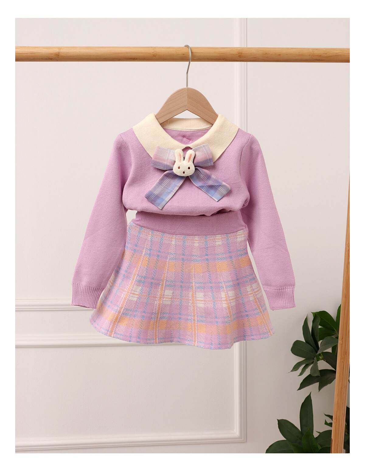 Set pentru fetițe, format din pulover cu guler, alături de fustiță cu elastic în talie pentru confort, brosa stil fundita. Confecționat din 73.5% bumbac și 26.5% poliester, acest set oferă combinația ideală între confort și estetică, fiind perfect pentru orice ocazie.
