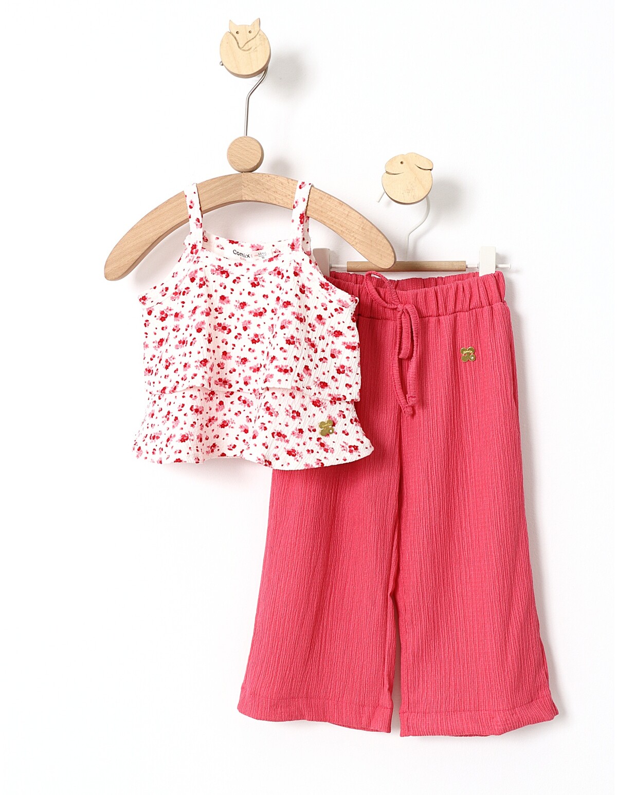 Imaginați-vă razele calde ale soarelui de vară, dansând pe petalele delicate ale florilor. Acesta este spiritul care a inspirat crearea setului nostru de vară, conceput cu dragoste pentru micile exploratoare cu vârste între 2 și 6 ani. Setul se compune din două piese desăvârșite pentru aventurile estivale: un maiou încântător, având două volănașe jucăușe care adaugă o notă de grație și feminitate, și pantaloni evazați, confortabili, cu elastic în talie pentru o potrivire perfectă. Materialul, o combinație răcoroasă de 95% poliester și 5% elastan, este ideal pentru zilele lungi de vară, oferind lejeritate și libertate de mișcare. Topul alb este împodobit cu floricele delicate, evocând un câmp infinit de flori sălbatice, în timp ce pantalonul simplu echilibrează ansamblul cu un stil curat și simplu. Acest set nu este doar o ținută, ci o invitație la joacă și descoperire, un companion perfect pentru zilele în care lumea pare o carte deschisă, plină de povești și aventuri așteptând să fie explorate. Oferă-i micuței tale bucuria pură a verii, îmbrăcată într-un set care reflectă frumusețea și veselia celor mai frumoase luni ale anului.