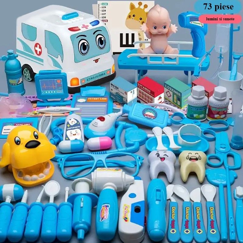 Set trusa de doctor pentru copii, 73 de piese, stetoscop, injectie, ambulanta, lumini, sunete, albastru Setul de trusa de doctor pentru copii, cu 73 de piese, este o jucarie educativa si interactiva, ideala pentru a dezvolta creativitatea si abilitatile sociale ale copiilor prin jocuri de rol. Acest set le permite celor mici sa isi imagineze ca sunt doctori, stimuland curiozitatea si empatia fata de profesia medicala. Acest set bogat include toate instrumentele esentiale pe care un doctor le-ar folosi intr-un cabinet sau pe o ambulanta, cum ar fi stetoscop, seringa, termometru, foarfeca medicala, bisturiu, pensete, tablete de medicamente si multe altele. Unul dintre cele mai atractive instrumente din set este stetoscopul, care emite sunete realiste ce imita bataile inimii. Acest efect adauga un nivel ridicat de interactivitate si realism jocului. Pe langa stetoscop, alte instrumente, cum ar fi otoscopul sau termometrul, sunt prevazute cu lumini. Acestea fac experienta de joaca mai captivanta si realista, ajutand copiii sa inteleaga mai bine cum functioneaza echipamentele medicale reale. Un alt punct de atractie este ambulanta de jucarie, care este echipata cu efecte sonore si lumini intermitente, similare cu cele ale unei ambulante reale. Copiii se pot juca salvand pacienti si transportandu-i la spital, dezvoltandu-si astfel imaginatia. Jocul de rol cu trusa medicala ii ajuta pe copii sa se familiarizeze cu vizitele la medic si cu echipamentele medicale, ceea ce poate reduce teama de medici. Copiii invata sa joace roluri de doctori si pacienti, incurajandu-le empatia, comunicarea si intelegerea proceselor medicale. De asemenea, manipularea diverselor instrumente medicale ajuta la dezvoltarea abilitatilor motorii fine si a coordonarii mana-ochi. Piesele sunt realizate din plastic rezistent si sigur pentru copii, avand margini rotunjite pentru a preveni orice accidentare. Specificatii: - joc trusa de doctor; - varsta recomandata 3 ani+; - contine 73 de piese; - ambulanta cu design realist; - lumni intermitente; - efecte sonore; - ajuta la invatarea jocurilor de rol; - dezvolta comunicarea, empatia si ajuta la intelegerea proceseor medicale; - margini rotunjite; - culoare albastra; - material plastic. Avertizare! Produsul este nou si comercializat in ambalajul original al producatorului. Imaginile de pe site au caracter informativ. Nuanta, tonul si intensitatea culorii pot varia in functie de monitor. Continutul sau culorile specificate pot varia fata de fotografiile prezentate pe ambalaj. Ambalajul nu este o jucarie, acesta trebuie indepartat, recuperat si aruncat de catre un adult inainte de a se da spre utilizare copilului. Produsul poate fi ambalat in punga si necesita indepartarea ei din preajma copilului existand pericolul de sufocare. Se recomanda utilizarea produsului sub supravegherea unui adult. Produsul poate contine piese mici care se pot inghiti sau inhala de cei mici, existand pericolul de sufocare. In cazul inghitirii unor astfel de piese, consultati de urgenta un specialist. Pastrati piesele mici deformate, rupte sau dezasamblate departe de copii. Pastrati etichetele pentru referinte viitoare. Pastrati produsul departe de foc si nu il expuneti temperaturilor ridicate si umiditatii. Materialul din care este confectionat produsul este nedaunator sanatatii si nontoxic. Produs testat conform standardelor internationale. Nerecomandat copiilor cu varsta mai mica de 3 ani! Produsul functioneaza cu ajutorul bateriilor (acestea nu sunt incluse). Bateriile trebuie sa fie uscate si se introduc de catre un adult in spatiul destinat, in pozitia corecta, respectandu-se polaritatea indicata. Compartimentul bateriilor trebuie sa fie curat. Bateriile epuizate se schimba si se recicleaza conform normelor in vigoare. In cazul neutilizarii jucariei pentru mai mult timp, se scot bateriile pana in momentul refolosirii. Nu reincarcati bateriile nereincarcabile. Bateriile reincarcabile trebuie scoase din jucarie inainte de a fi reincarcate. Acestea se utilizeaza numai de catre un adult. Nu utilizati baterii de diferite tipuri, nu utilizati in comun baterii vechi si noi. Nu scurtcircuitati sursa de alimentare pentru a evita riscul potential. Pentru a monta bateriile este necesar ca un adult sa desfaca intai surubul de protectie de pe capacul locului special cu ajutorul unei surubelnite, introduceti bateriile respectand polaritatea. Apoi inchideti compartimentul si asigurati-l cu montarea surubului de siguranta. Atentie! Nu utilizati acumulatori reincarcabili impreuna cu baterii pentru a alimenta produsul.