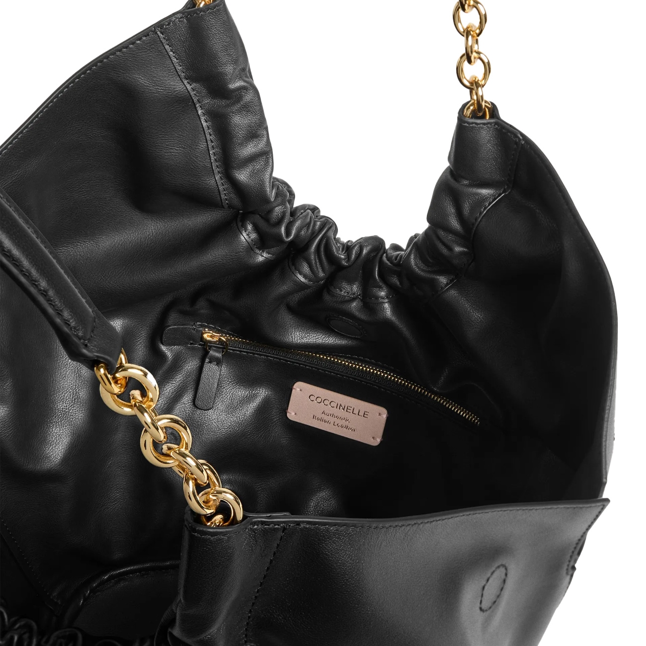 Smash Medium exprimă o estetică contemporană și feminină, definită de linii fluide și un volum generos. Realizată din piele netedă, tratată cu uleiuri speciale pentru a obține o textură moale și plăcută la atingere, aceasta își păstrează aspectul natural și oferă o bună rezistență la factorii externi datorită finisajului protector. Lanțul metalic adună delicat pielea, creând pliuri suple, iar inserția din piele adăugată pe lanț sporește confortul la purtare. Logo-ul C Me completează designul, iar interiorul cu două buzunare, dintre care unul cu fermoar, asigură organizare practică pentru utilizarea zilnică.