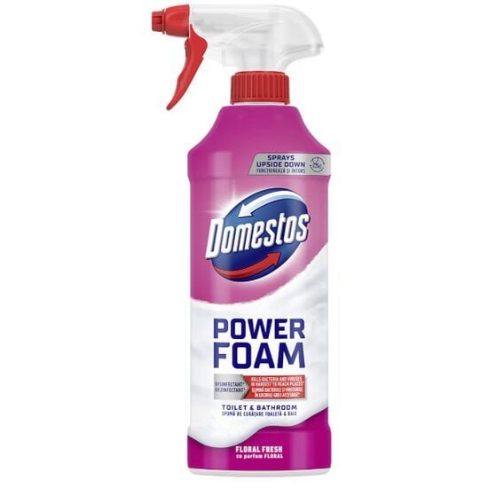 Solutie de curatare baie DOMESTOS Power Foam Spray, Floral Burst, 435 mlDomestos Power Foam Spray Spuma de curatare cu parfum Floral 435ml este un produs dezinfectant sub forma de spuma pentru curatarea toaletei si baii, care elimina bacteriile si virusurile in locurile cel mai greu accesibile (Elimina bacterii ca E.Coli, S.Aureus, E.Hirae, P. Aeruginosa si virusuri anvelopate ca Vaccinia ATCC VR-1549).- Special conceput sa functioneze si intors pana la ultima picatura, acest produs este usor de folosit si mult mai convenabil;- Spuma activa acopera cu usurinta suprafetele pentru a indeparta murdaria si calcarul;- Este potrivit pentru a curata atat vasul de toaleta cat si suprafetele lavabile din baie;- Varianta cu parfum de Lamaie are un parfum bio-degradabil, de flori, fara miros de clor.INGREDIENTE:<5% surfactanti amfoterici, surfactanti cationici, surfactanti neionici; parfum. Dezinfectant: Clorura de alchil (C12-16) dimetilbenzil amoniu (CAS 68424-85-1, EC 270-325-2), 0,75 g in 100 g produs.INSTRUCTIUNI DE UTILIZARE:Pentru dezinfectare: Pulverizati produsul uniform pe suprafata, lasati sa actioneze timp de 30 minute dupa care stergeti cu o carpa umeda. Se poate pulveriza si sub marginea vasului de toaleta dupa care lasati sa actioneze 30 minute, trageti apa si daca este necesar, folositi peria.Pentru curatare: Pulverizati produsul uniform pe suprafata, lasati sa actioneze timp de 1 minut dupa care stergeti cu o carpa umeda. Se poate pulveriza si sub marginea vasului de toaleta dupa care lasati sa actioneze 1 minut, trageti apa si daca este necesar, folositi peria.Precautii: Nu utilizati pe marmura si linoleum. Clatiti bine imediat dupa aplicarea pe lemn vopsit, aluminiu anodizat si scaune de toaleta. Pentru pietre naturaleMod ambalare 12/Bax