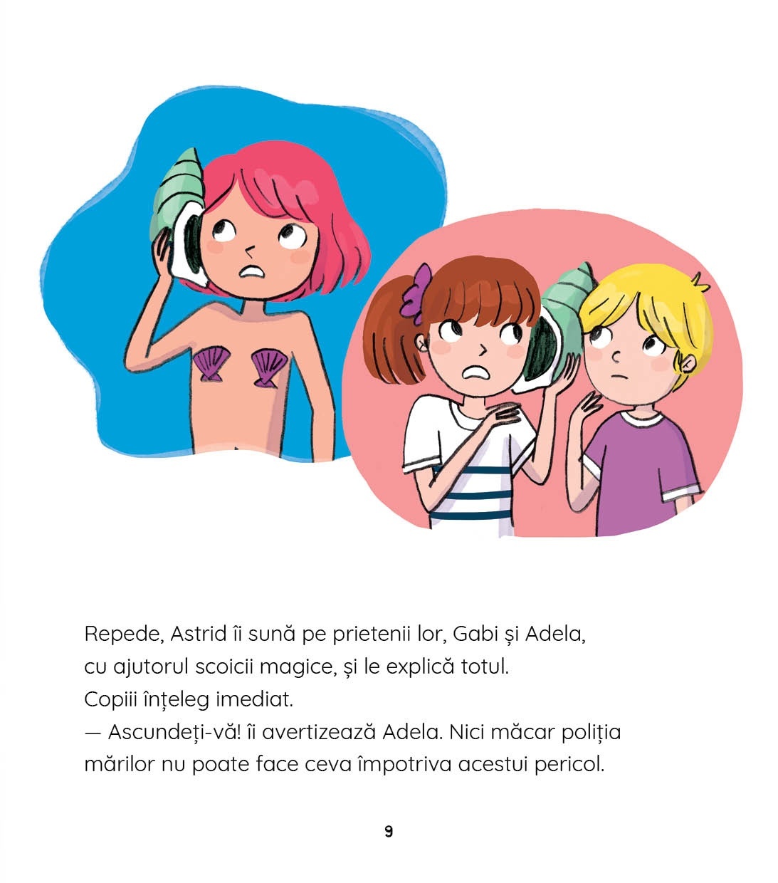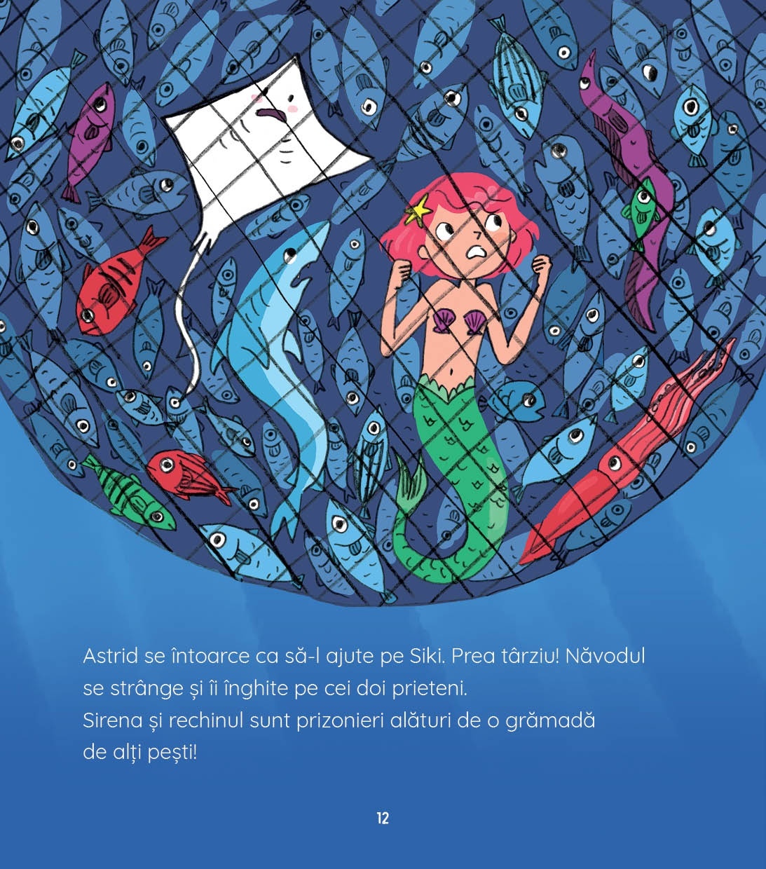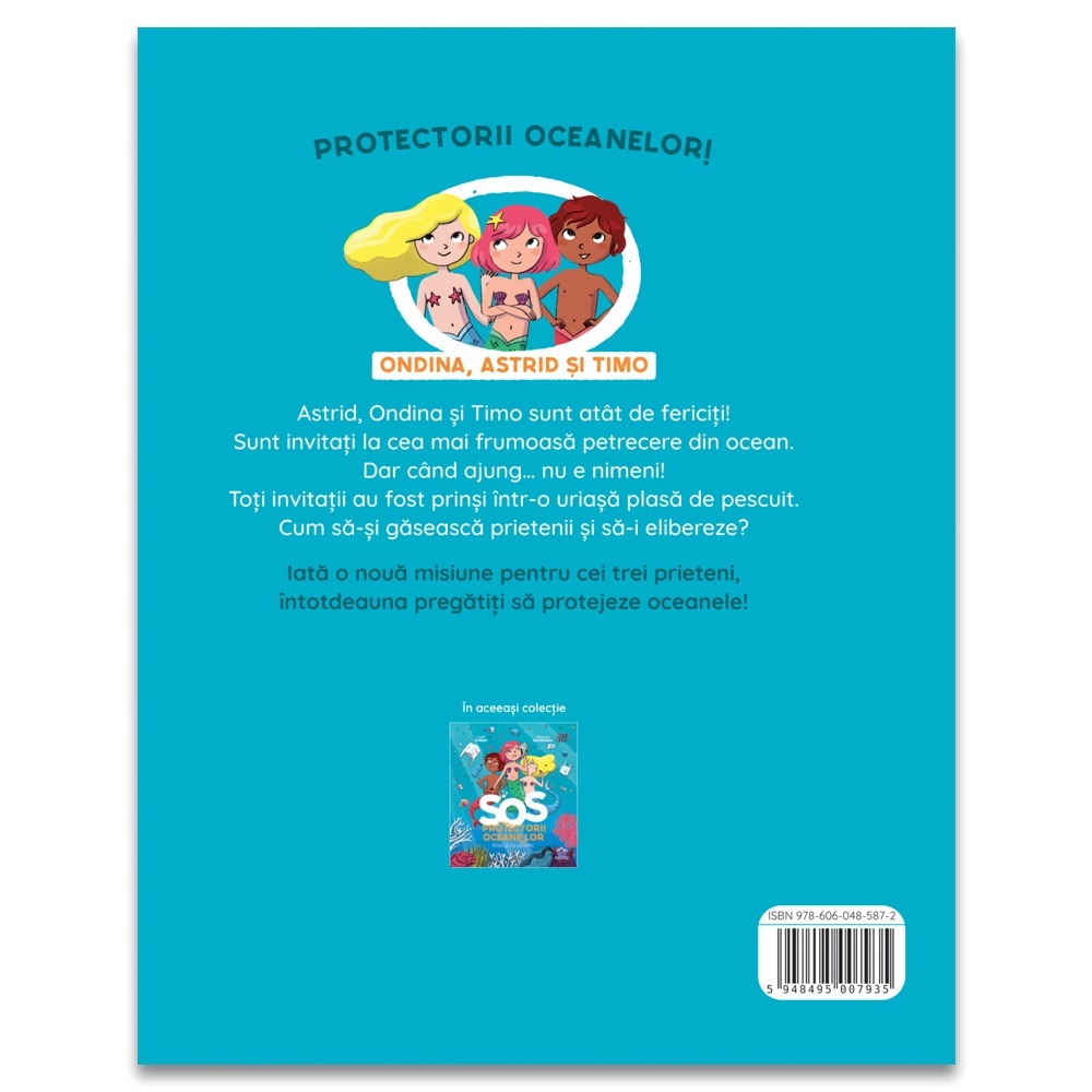 Astrid, Ondina și Timo sunt atât de fericiți! Sunt invitați la cea mai frumoasă petrecere din ocean. Dar când ajung… nu e nimeni, locul petrecerii este pustiu și complet deteriorat! Toți invitații au fost prinși într-o uriașă plasă de pescuit. Cum să-și găsească prietenii și să-i elibereze? Iată o nouă misiune pentru cei trei prieteni, întotdeauna pregătiți să protejeze oceanele! Cartea abordează într-o manieră atractivă și accesibilă probleme ce țin de poluarea mărilor, având ca scop creșterea gradului de conștientizare asupra problemelor de mediu. Cu ajutorul acesteia, copiii vor obține informații despre poluarea apei. Este esențial ca cei mici să afle informații despre poluarea oceanului planetar și să învețe să ia măsuri pentru protejarea lui. Copiii au întotdeauna un rol important de jucat în ajutorarea sirenelor, pentru că întotdeauna sunt lucruri pe care fiecare le poate face la nivelul său! Despre autor: Gaël Aymon și-a început cariera ca actor, apoi ca scenarist și regizor. Produce și distribuie filme, spectacole și concerte și predă teatru copiilor și adolescenților. Primele sale cărți pentru copii au fost publicate începând cu 2010. Mélanie Roubineau, absolventă în animație multimedia la Școala de Comunicare Vizuală din Bordeaux (2004-2008), este ilustratoare și designer. Aceasta lucrează pentru presă și edituri pentru copii și adolescenți. Traducător: Anca Măgurean Numărul proiectului: 101059305 Project name: Literatura europeana pentru copii despre ecologie si mediu Project acronym: LECEM