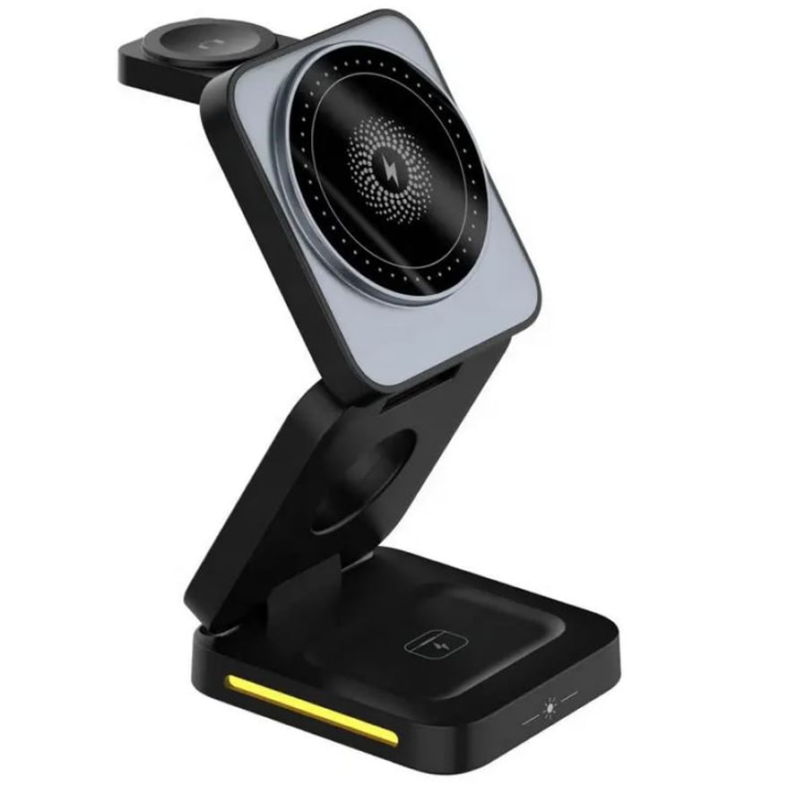 Stația wireless 3 in 1 este o soluție elegantă, compactă și eficientă pentru a-ți încărca toate dispozitivele. Încărcare wireless 15W 3 Suprafețe de încărcare Adsorbție magnetică pentru telefon Design pliabil si elegant
