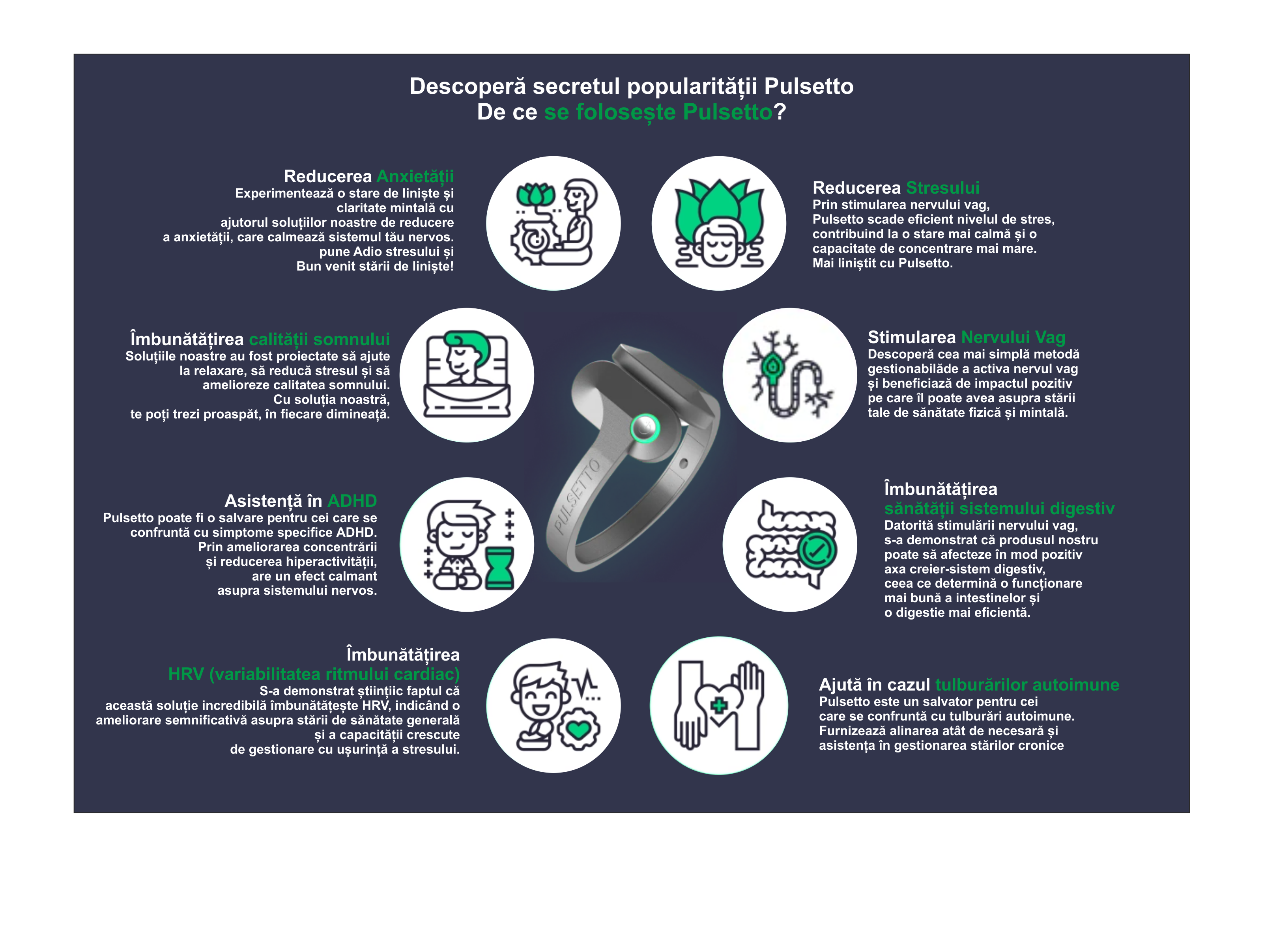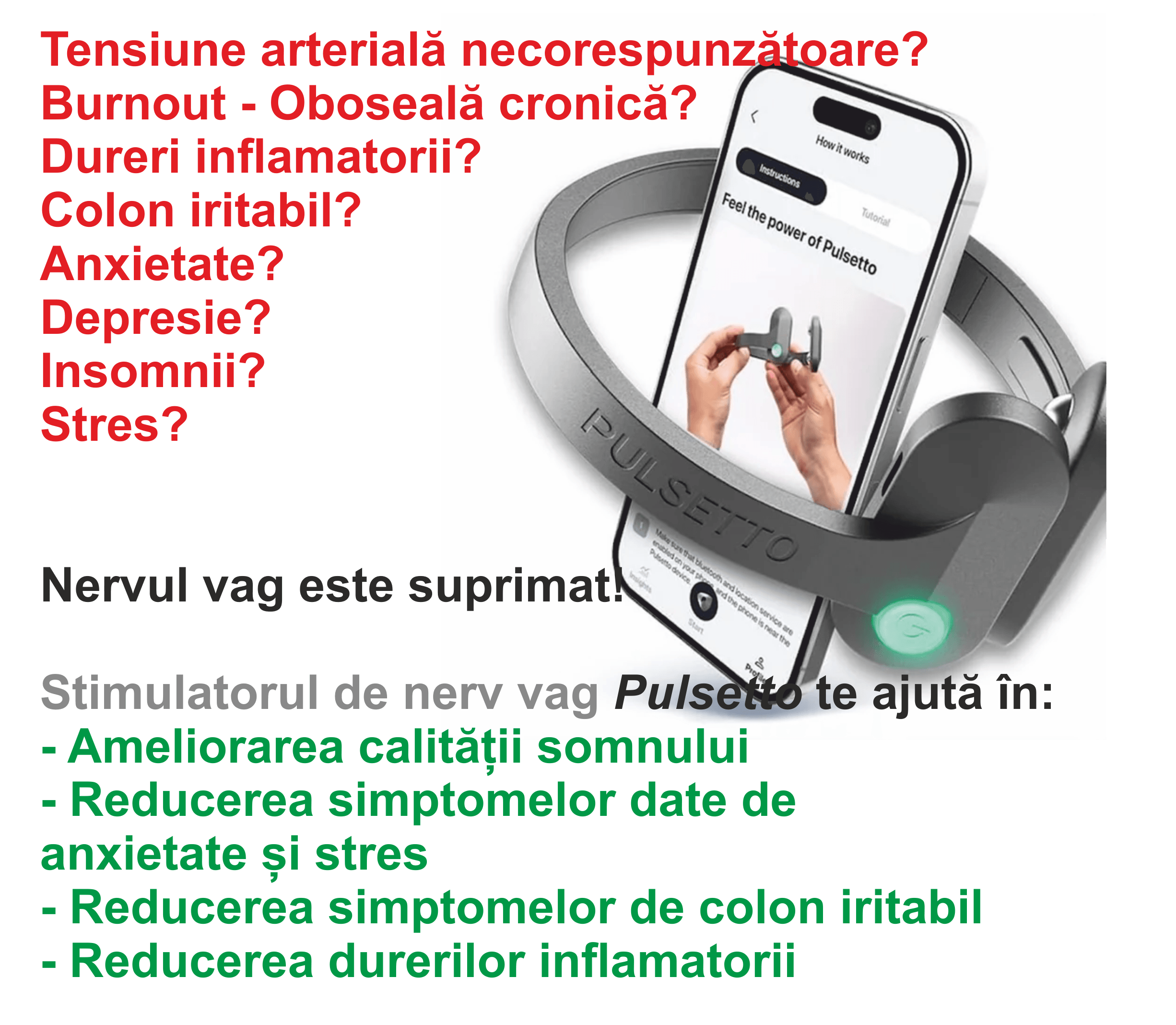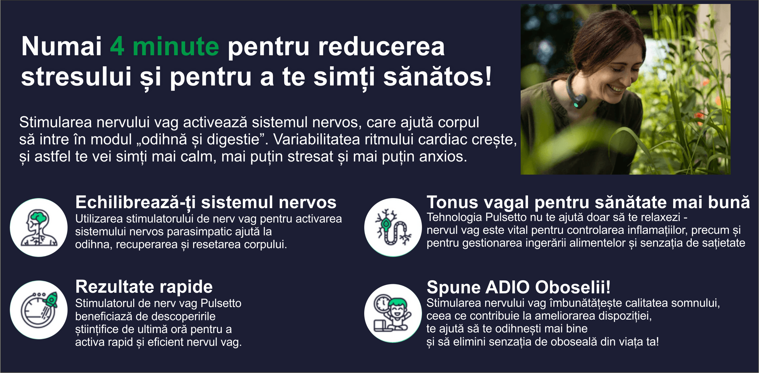 Pulsetto este un dispozitiv modern, destinat stimularii nervului vag. /nBazat pe cercetari indelungate, acest produs, prin stimularea nervului vag, contribuie in mod demonstrat la: /n- imbunatatirea calitatii somnului /n- reducerea efectelor stresului /n- ameliorarea simptomelor cauzate de stres, anxietate si depresie /n- ameliorarea simptomelor de colon iritabil, balonare, diaree, constipatie /n- reglarea apetitului in mancatul compulsiv /n- imbunatarea variabilitatii ritmului cardiac (HRV) /n- asistenta in ADHD la adulti /n /nNervul vag face parte din sistemul nervos parasimpatic, responsabil de modul de digestie si odihna (rest and digest), fiind cel mai lung nerv din corpul uman, raspandit in majoritatea organelor: inima, plamani, sistem digestiv etc. Acesta trimite semnale de la organe catre creier si invers, de la creier catre organe. In urma unor evenimente reprezentate de creierul nostru ca fiind periculoase (stresante), apar senzatiile cum ar fi cele de fluturi in stomac, strangerea stomacului, respiratie ingreunata, batai de inima etc. /nDe multe ori, sistemul nervos simpatic (responsabil de reactia lupta sau fuga) ramane blocat in modul pe care il declanseaza: de lupta sau fuga. /nActivarea nervului vag echilibreaza raspunsul organismului la evenimentele stresante indelungate, iar Pulsetto face exact acest lucru: stimuleaza raspunsul de odihna si digestie al organismului, corpului nostru la evenimentele externe. /nPrin utilizarea stimulatorului de nerv vag timp de 15 sedinte, o data pe zi, 86% dintre clienti au raportat o reducere cu 64% a nivelului de stres si anxietate, o imbunatatire cu 27% a calitatii somnului, 35% a dispozitiei si 47% a capacitatii de concentrare.