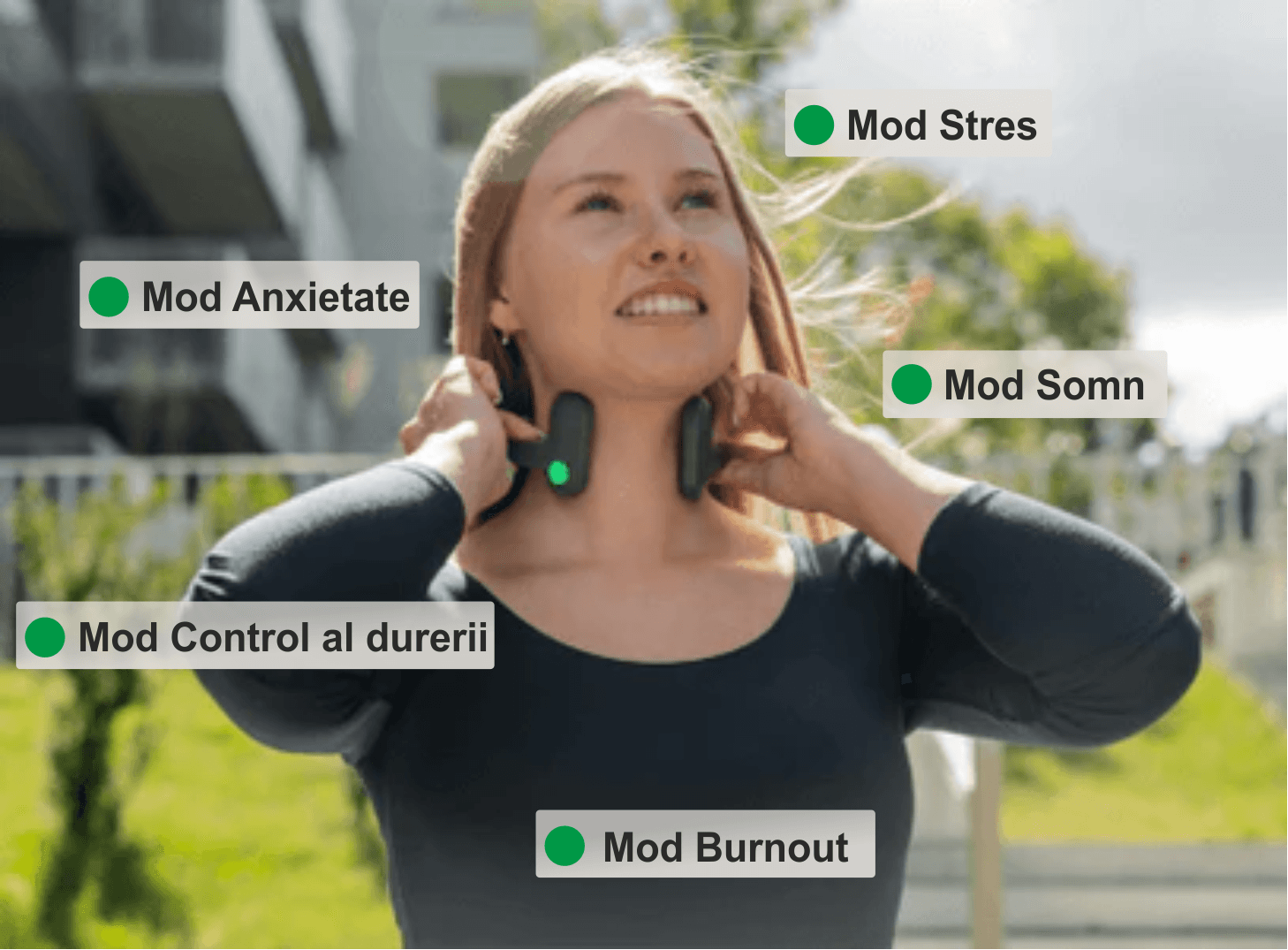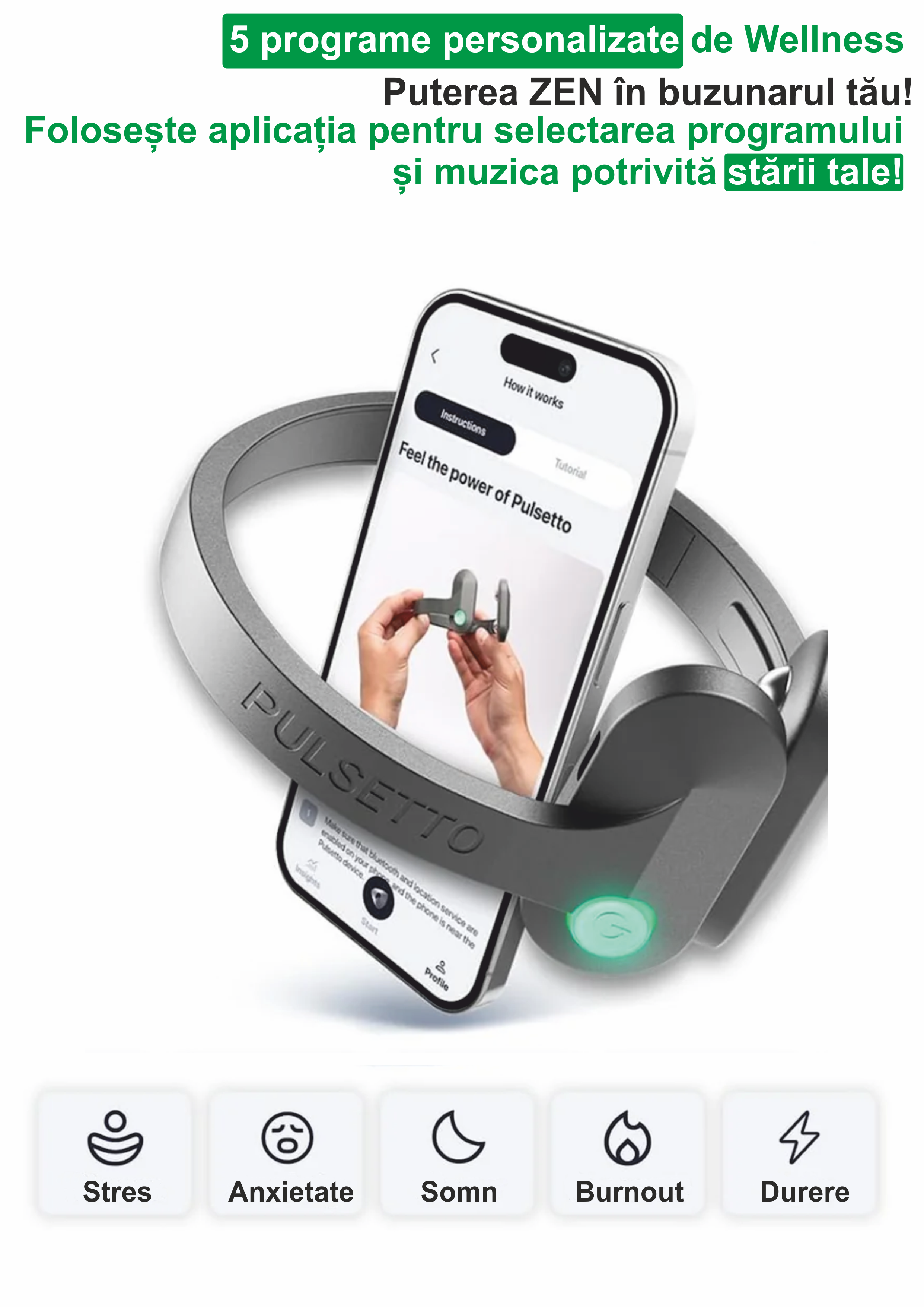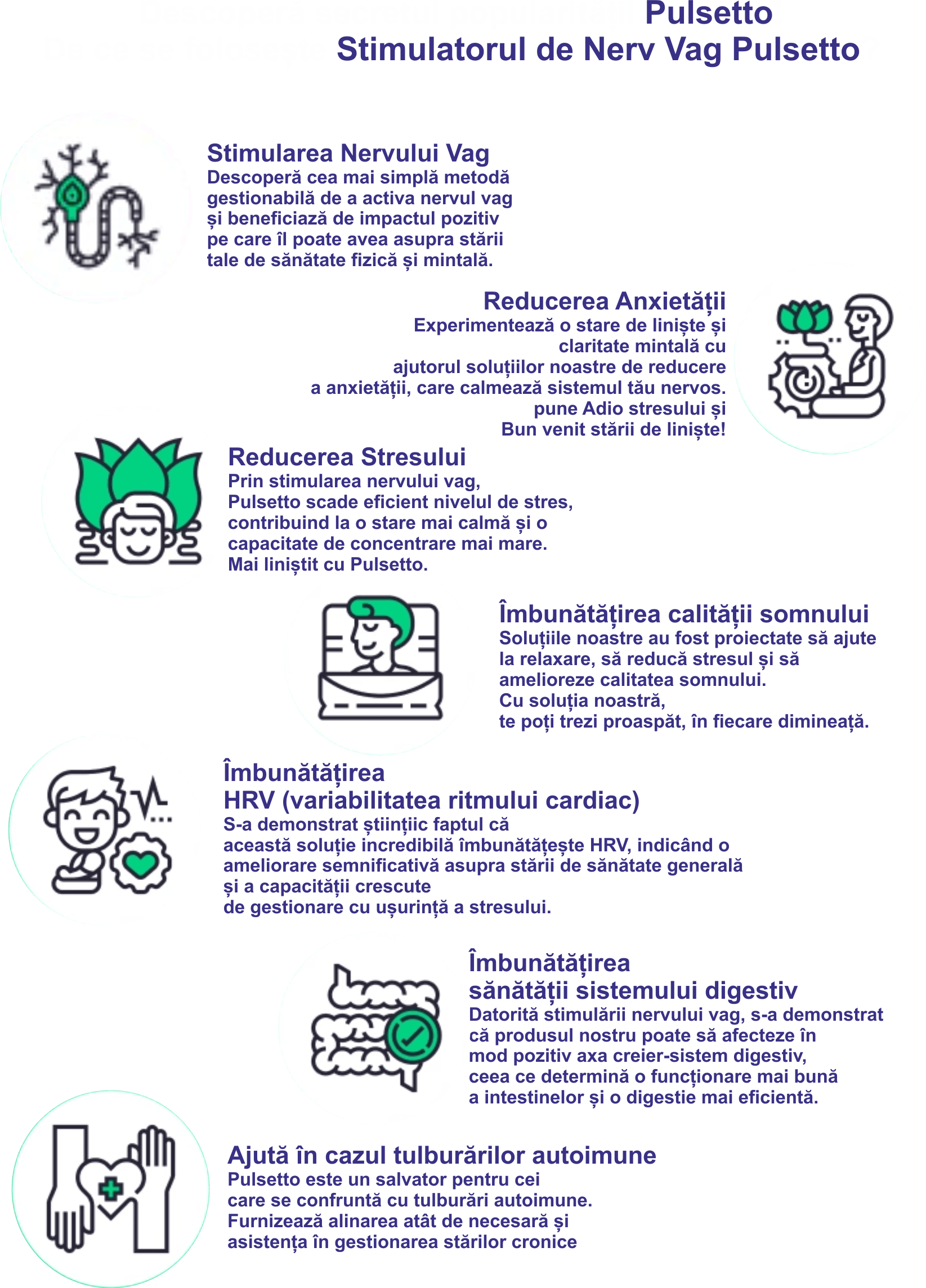 Pulsetto este un dispozitiv modern, destinat stimularii nervului vag. /nBazat pe cercetari indelungate, acest produs, prin stimularea nervului vag, contribuie in mod demonstrat la: /n- imbunatatirea calitatii somnului /n- reducerea efectelor stresului /n- ameliorarea simptomelor cauzate de stres, anxietate si depresie /n- ameliorarea simptomelor de colon iritabil, balonare, diaree, constipatie /n- reglarea apetitului in mancatul compulsiv /n- imbunatarea variabilitatii ritmului cardiac (HRV) /n- asistenta in ADHD la adulti /n /nNervul vag face parte din sistemul nervos parasimpatic, responsabil de modul de digestie si odihna (rest and digest), fiind cel mai lung nerv din corpul uman, raspandit in majoritatea organelor: inima, plamani, sistem digestiv etc. Acesta trimite semnale de la organe catre creier si invers, de la creier catre organe. In urma unor evenimente reprezentate de creierul nostru ca fiind periculoase (stresante), apar senzatiile cum ar fi cele de fluturi in stomac, strangerea stomacului, respiratie ingreunata, batai de inima etc. /nDe multe ori, sistemul nervos simpatic (responsabil de reactia lupta sau fuga) ramane blocat in modul pe care il declanseaza: de lupta sau fuga. /nActivarea nervului vag echilibreaza raspunsul organismului la evenimentele stresante indelungate, iar Pulsetto face exact acest lucru: stimuleaza raspunsul de odihna si digestie al organismului, corpului nostru la evenimentele externe. /nPrin utilizarea stimulatorului de nerv vag timp de 15 sedinte, o data pe zi, 86% dintre clienti au raportat o reducere cu 64% a nivelului de stres si anxietate, o imbunatatire cu 27% a calitatii somnului, 35% a dispozitiei si 47% a capacitatii de concentrare.