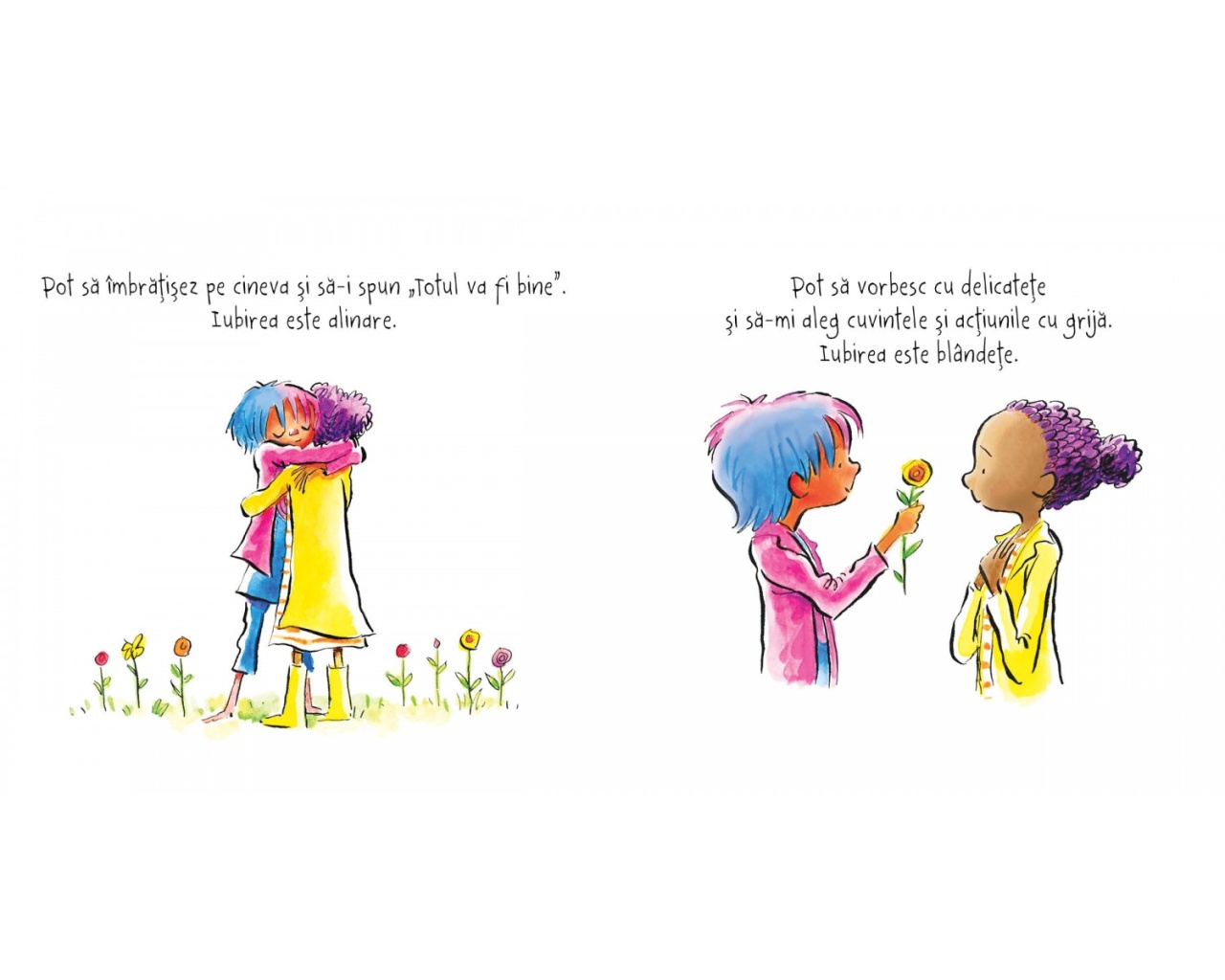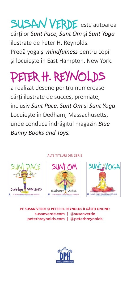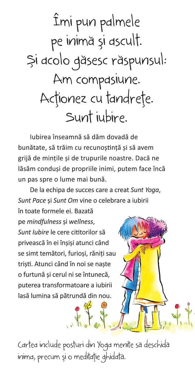# Bestseller New York Times „Îmi pun palmele pe inimă și ascult. Și acolo găsesc răspunsul: am compasiune. Acționez cu tandrețe. Sunt iubire.” Susan Verde și Peter H. Reynolds își continuă colaborarea cu cea de-a patra carte din seria lor de bestseller. O sărbătoare a iubirii în toate formele sale, cartea “Sunt iubire” le cere cititorilor să privească înăuntru atunci când se simt furioși, temători sau triști. Atunci cand în noi se naște o furtună și cerul ni se întunecă, puterea transformatoare a iubirii lasă lumina să pătrundă din nou. Iubirea înseamnă să dăm dovadă de bunătate, să trăim cu recunoștință și să avem grijă de mințile și de trupurile noastre. Cartea se adresează tuturor copiilor cu vârsta peste 4 ani și explorează numeroase aspecte ale iubirii care pot ajuta pe cineva să treacă prin orice furtună; explică faptul că iubirea înseamnă alinare, efort, conexiune și a avea grijă de sine. Include posturi din yoga menite să deschidă inima, precum și o meditație ghidată. Iubirea este pretutindeni! Se află în noi și în jurul nostru și sunt atâtea căi prin care poate fi împărtășită și exprimată! Dar, uneori, în viață se întâmplă lucruri care ne fac să fim temători, triști sau neajutorați, iar capacitatea noastră de a găsi acea iubire se poate pierde. “Sunt Iubire” este o explorare a numeroaselor forme în care există iubirea și o afirmare a faptului că, odată ce ne ascultăm inimile și găsim iubirea din noi înșine, o putem împărtăși cu lumea, găsind conexiune și compasiune. Această carte vă provoacă la discuții, cu fiii și fiicele dumneavoastră, despre iubire în toate formele ei, despre faptul că nu suntem neajutorați, ci, dimpotrivă, avem puterea de a face lumea mai frumoasă atunci când suntem mânați de iubire. Despre autor Susan Verde este autoarea cărților „Sunt Yoga”, „Sunt Pace” și „Sunt Om”, ilustrate de Peter H. Reynolds. Este o instructoare certificată de mindfulness și yoga pentru copii și locuiește în East Hampton, New York. Peter H. Reynolds a realizat desene pentru numeroase cărți ilustrate de succes, premiate, inclusiv „Sunt Yoga”, „Sunt Pace” și „Sunt Om”. Este renumitul ilustrator din spatele celor mai vândute seriale Judy Moody și Stink, precum și multe alte cărți de imagini cele mai vândute și premiate, inclusiv The Dot și Ish. Locuiește în Dedham, Massachusetts., unde conduce îndrăgitul magazin Blue Bunny Books and Toys. Specificații Vârstă: 4+ ani Pagini: 40 Mărimi: 21 x 21 cm Copertă: Cartonată + supracopertă