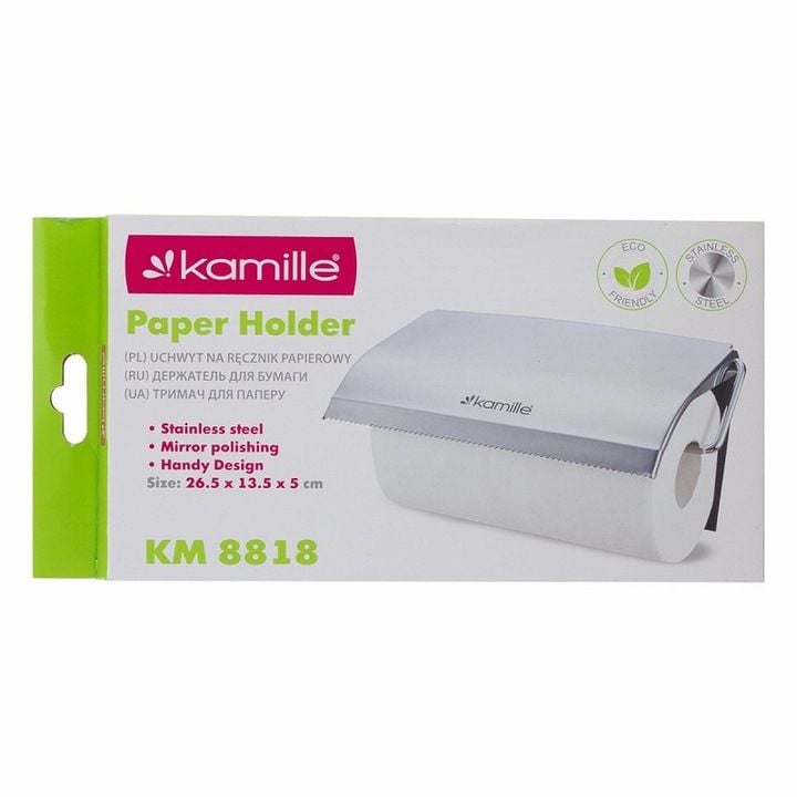 Suport Prosoape de Hârtie Kamille (KM 5051) - Inox, Montare Versatilă (26.5 x 13.5 x 5 cm)Acest Suport de Prosoape de Hârtie Kamille este un accesoriu funcțional și elegant, proiectat pentru a menține rola de prosoape uscată, igienică și la îndemână. Finisajul din Inox se integrează perfect în orice bucătărie modernă sau profesională. Material Premium: Construit din Oțel Inoxidabil (Inox), cu finisaj lucios/satinat, asigurând rezistență la rugină, durabilitate și curățare ușoară. Design Ergonomic: Forma (tip triunghi/copertină) protejează rola de stropi și murdărie. Tăiere Eficientă: Marginea inferioară este prevăzută cu un dantelaj fin (sau o lamă ascunsă) care permite ruperea ușoară și curată a foilor de prosop. Utilizare Versatilă: Poate fi folosit ca suport de Blat/Masă sau montat pe Perete/Sub dulap (dacă modelul permite) pentru a economisi spațiu. Avantaje Cheie pentru Partenerii B2B (Achiziții Engros): Aspect Premium: Finisajul din Inox îl plasează pe segmentul de accesorii de bucătărie de înaltă calitate, ideal pentru revânzare. Funcționalitate și Igienă: Protejează prosoapele de contaminare și asigură o rupere rapidă, esențială în bucătăriile aglomerate. Cerere Universală: Este un produs de bază, indispensabil, care asigură o cerere constantă din partea clienților. Marjă de Profit: Excelent pentru cross-selling cu seturi de ustensile, organizatoare și alte accesorii de Inox.