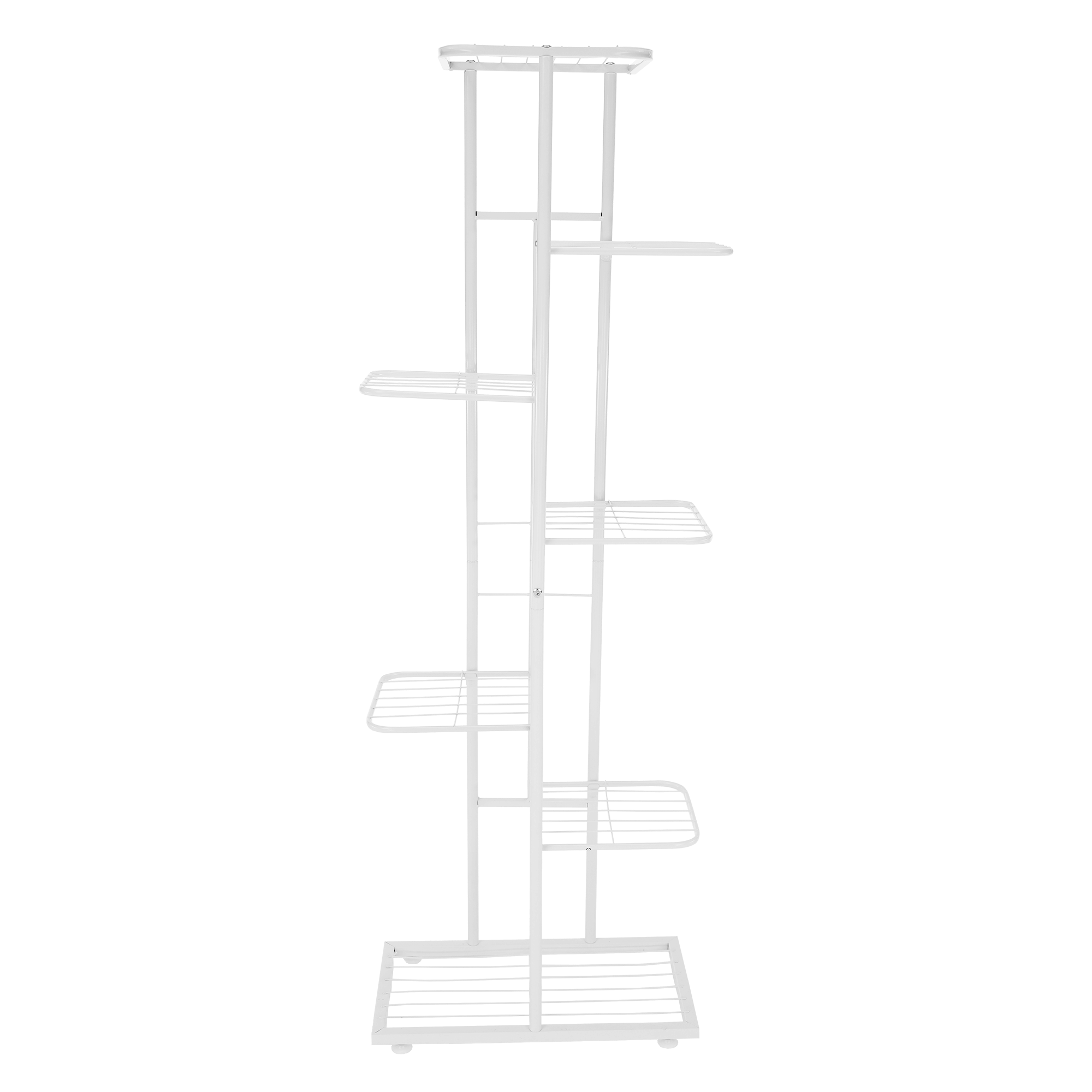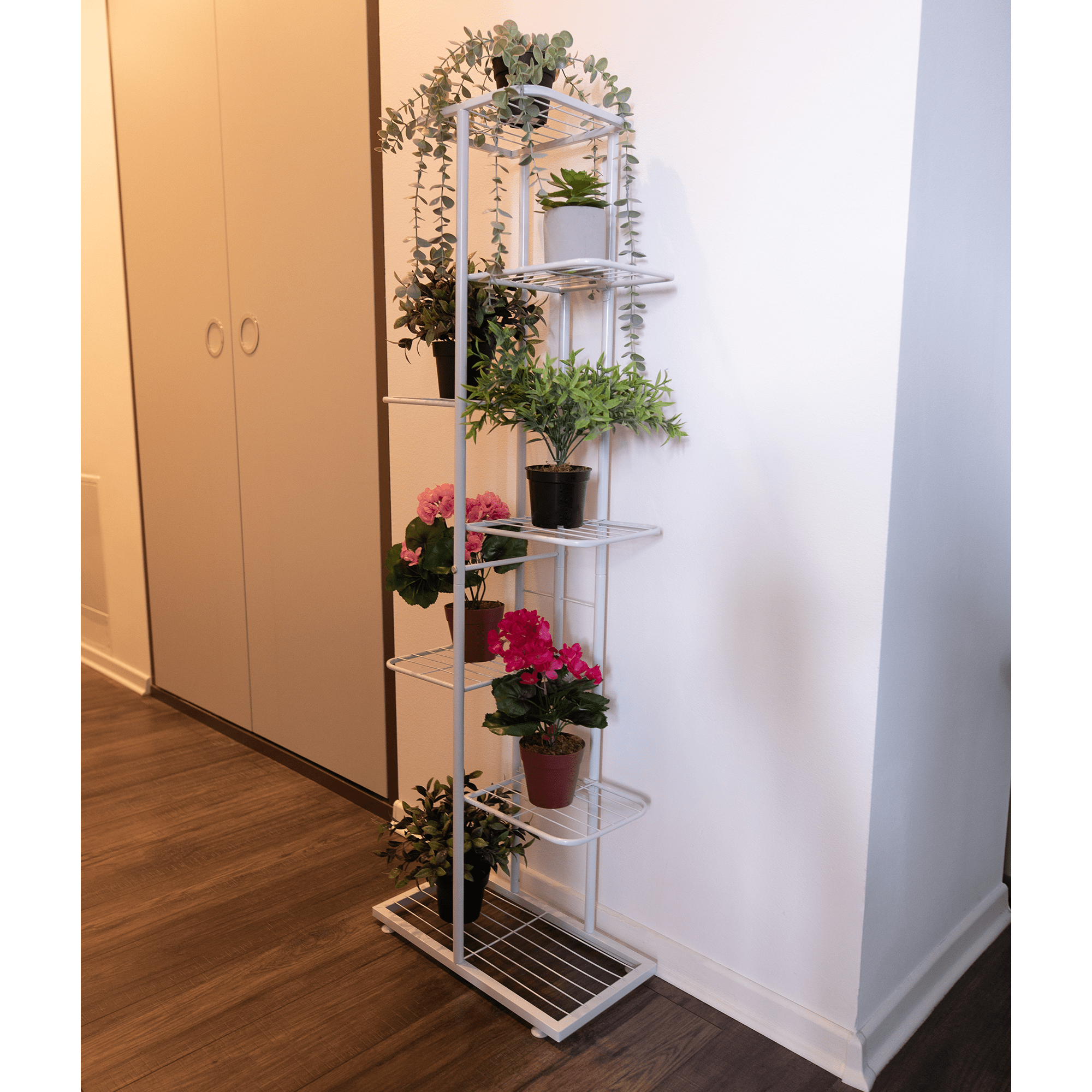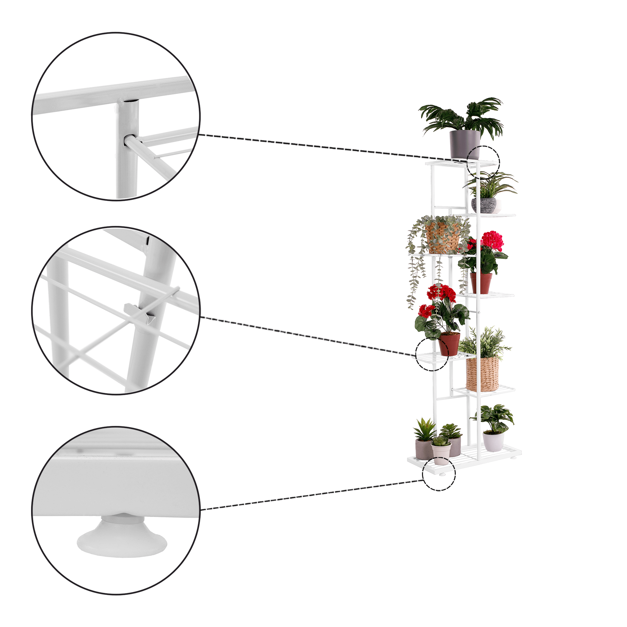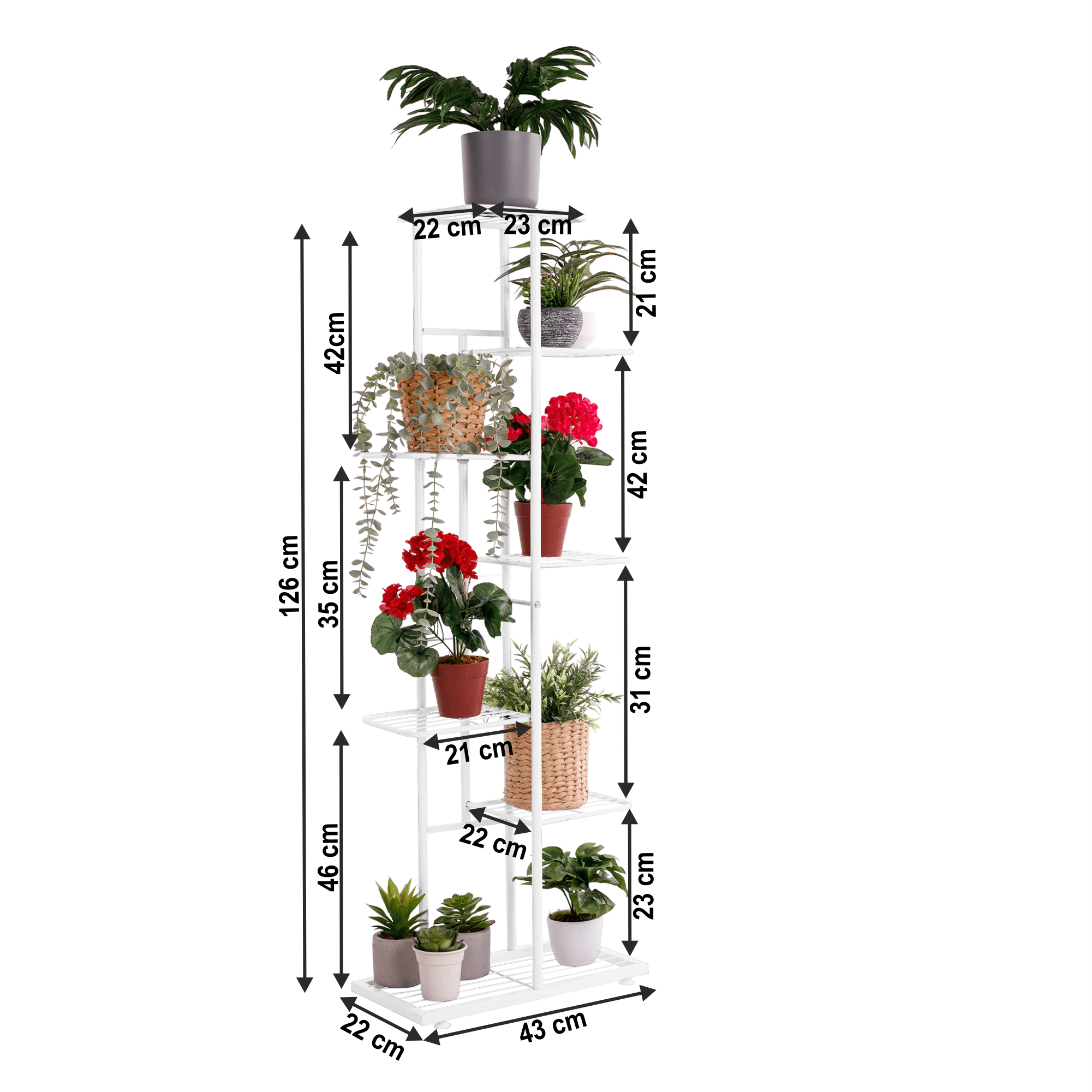 Material: metal Culoare: alb Dimensiuni (LxIxH): 43x22x126 cm Capacitate de incarcare pe raft: 2 kg Grosime bare: 1,6 cm Dimensiuni raft (Lxl): 21x22 cm Inaltimea raftului inferior: 23 cm Inaltimea celui de-al doilea raft: 31 cm Inaltimea celui de-al treilea raft: 42 cm Inaltimea raftului superior: 21 cm Constructie metalica 7 rafturi Stil modern Ca suport pentru plante in ghivece Picioare finisate, flexibile pentru a compensa denivelarile de suprafata