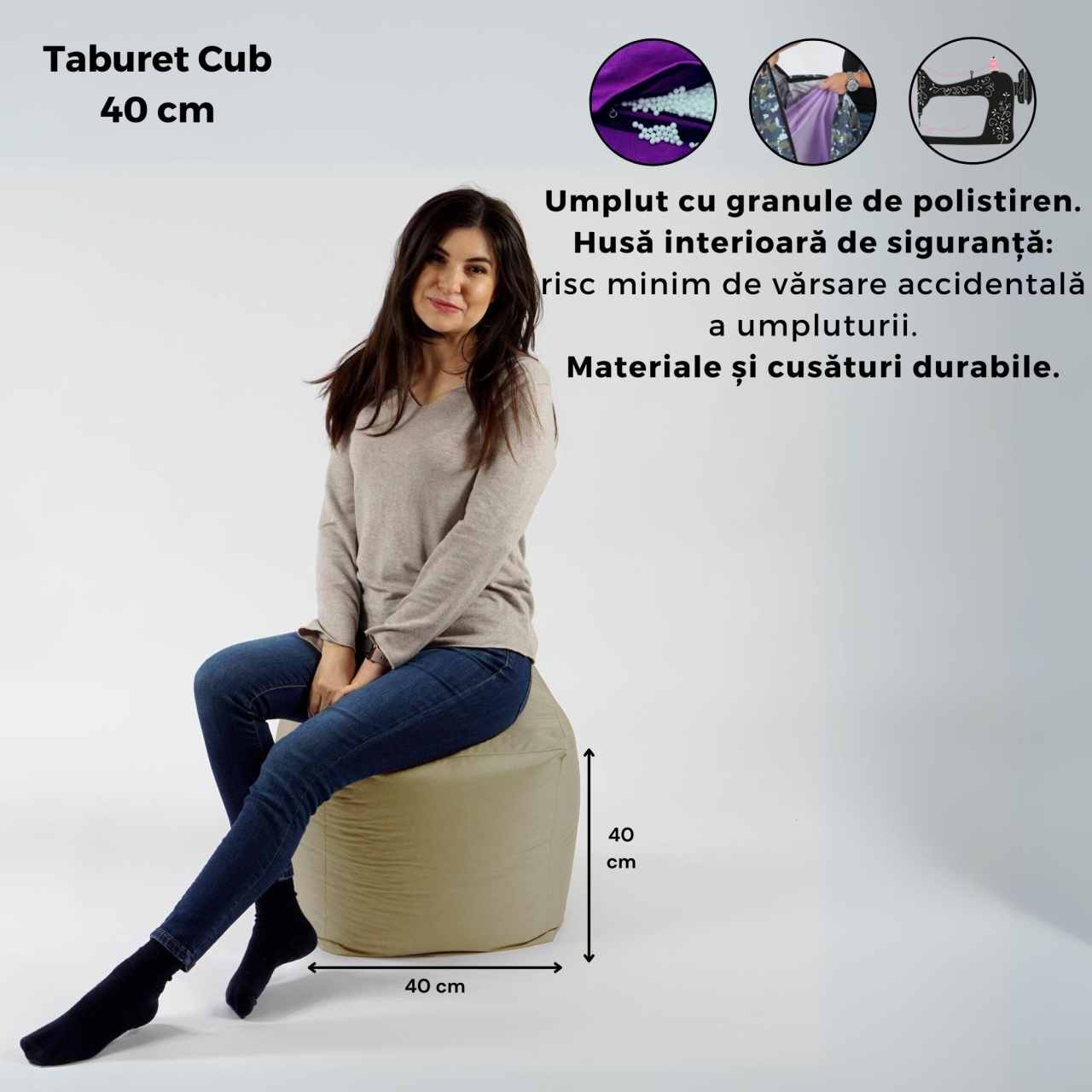 Taburetul Cub Pufrelax este un puf compact și practic, creat pentru cei care își doresc un loc confortabil de ședere fără a ocupa mult spațiu. Acest taburet puf tip cub combină designul simplu cu funcționalitatea, fiind o soluție ideală pentru relaxare sau pentru un loc suplimentar de ședere. Datorită dimensiunilor sale reduse și greutății mici, cubul puf poate fi mutat foarte ușor oriunde ai nevoie de el. Îl poți folosi ca taburet puf, suport pentru picioare sau scaun auxiliar, fiind o alegere practică pentru momentele de relaxare de zi cu zi. Umplutura din perle de polistiren permite taburetului să se adapteze ușor la poziția corpului, oferind un nivel plăcut de confort în timpul utilizării. În același timp, forma cubică îl face stabil și ușor de poziționat lângă o canapea, o măsuță sau într-un colț de relaxare. Taburetul Pufrelax Cub este potrivit pentru spații precum livingul, camera copiilor sau zona de relaxare, fiind ușor de integrat în aproape orice stil de amenajare. Culorile variate și materialele rezistente îl transformă într-un element practic și decorativ în același timp. Fabricat în România, cu materiale premium și cusături durabile Fotoliile Pufrelax sunt fabricate în România folosind materiale premium și cusături rezistente. Experimentează calitatea superioară a materialelor noastre și bucură-te de durabilitatea produselor în timpul sesiunilor de relaxare. Fotoliile Pufrelax au o durată mare de viață și o calitate superioară altor fotolii puf de pe piață. Husele sunt confecționate din materiale durabile și plăcute la atingere, disponibile într-o varietate de culori și texturi pentru a se potrivi oricărui stil de decor. 3 tipuri de materiale de înaltă calitate disponibile Husă exterioară din material textil, pentru folosirea în casă: living, dormitor, birou sau camera copilului Husă exterioară din material impermeabil, rezistentă UV și la intemperii – variante: Teteron (TEX) și Panama (PEX) Husă exterioară din piele ecologică, foarte rezistentă și ușor de curățat Datorită greutății reduse, fotoliile puf cu perle de polistiren sunt ușor de mutat dintr-o cameră în alta. De ce să alegi un fotoliu Pufrelax umplut cu Perle de Polistiren? 2 Ani Garanție pentru husa exterioară Beneficiezi de o garanție de 2 ani pentru husă, oferindu-ți liniștea că produsul tău va rămâne în cea mai bună stare pentru mult timp. Husă detașabilă și lavabilă Husa textilă sau impermeabilă este detașabilă și lavabilă, ceea ce face curățarea foarte ușoară. Husa exterioară poate fi spălată la mașina de spălat la 30 °C. Granule de polistiren virgine – calitate superioară Fotoliile Pufrelax sunt umplute cu granule virgine de polistiren expandat EPS 50, de cea mai bună calitate. După o perioadă de utilizare, granulele se pot tasa și pot necesita completare. Atenție la granulele pentru șapă sau cele rezultate din deșeuri, care pot avea miros neplăcut sau pot conține mult praf. Dimensiuni Latură: 40 cm Greutate: aproximativ 1 kg Disclaimer: Pozele secundare precum și videoclipurile au rol de prezentare sau exemplificare.