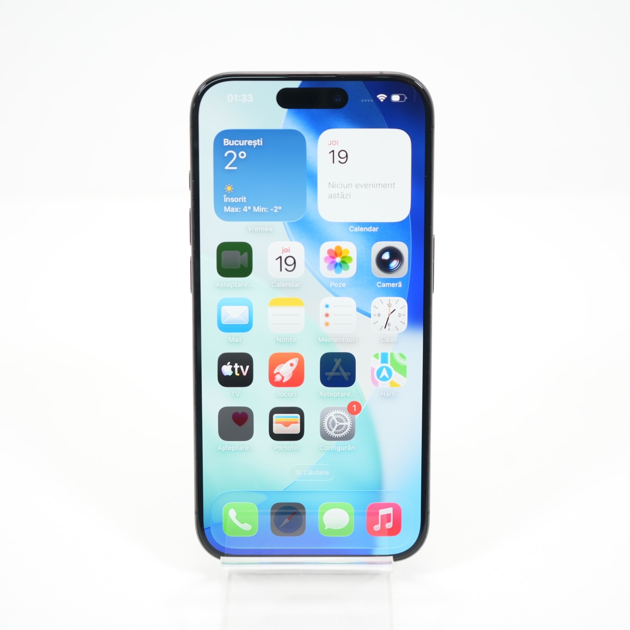Ecran: 6.1, Refresh Rate 120 Hz Procesor: Apple A17 Pro Memorie RAM: 8 GB Memorie interna: 128GB Camera Foto: Principala 48 MPx, Frontala 12 MPx Stare retea: Liber de rețea