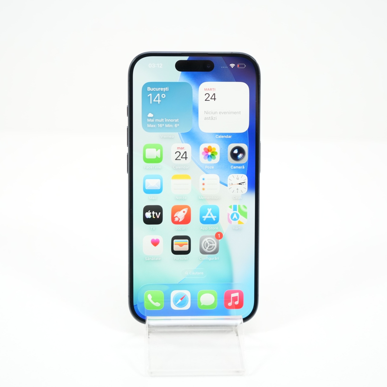 Ecran: 6.1, Refresh Rate 120 Hz Procesor: Apple A17 Pro Memorie RAM: 8 GB Memorie interna: 128GB Camera Foto: Principala 48 MPx, Frontala 12 MPx Stare retea: Liber de rețea