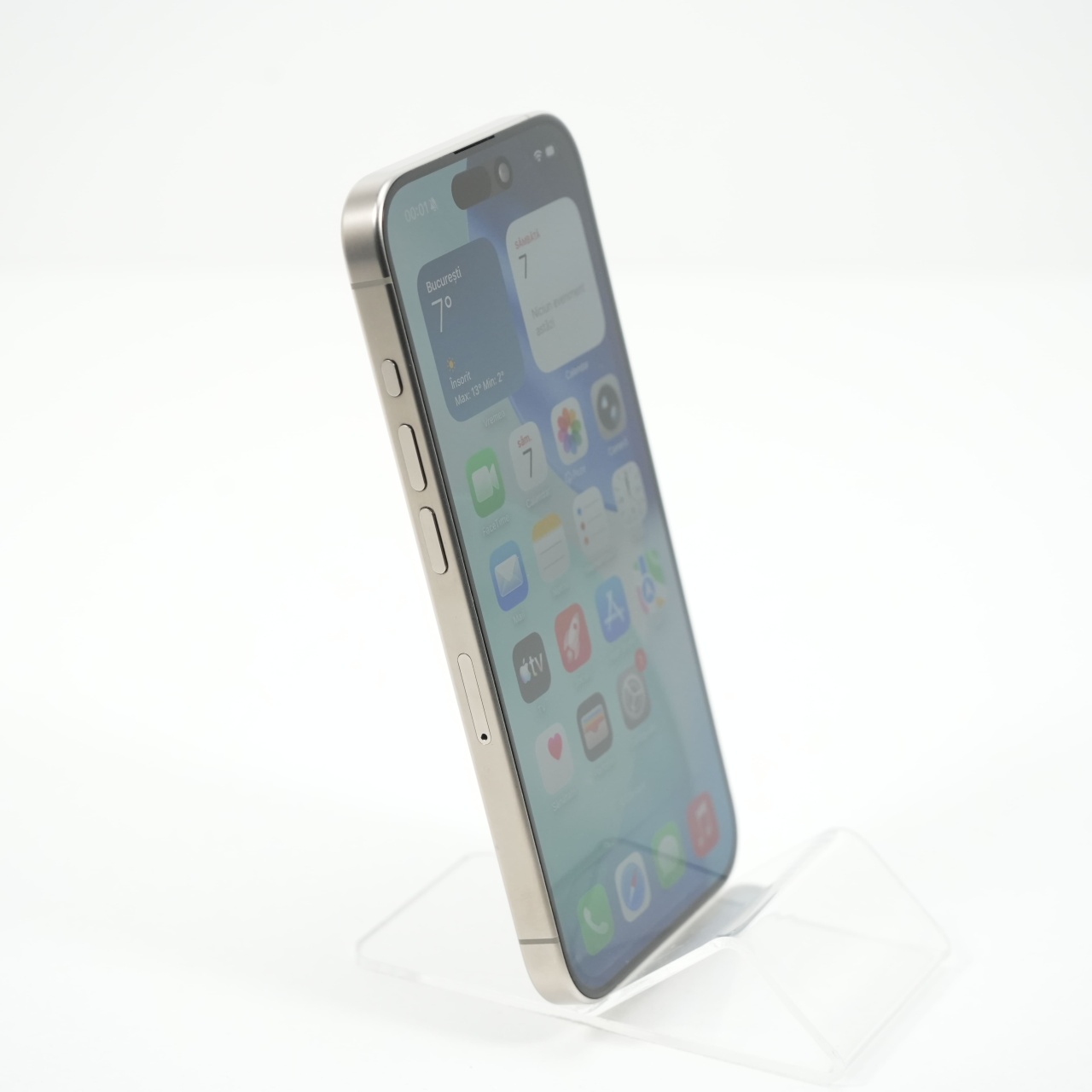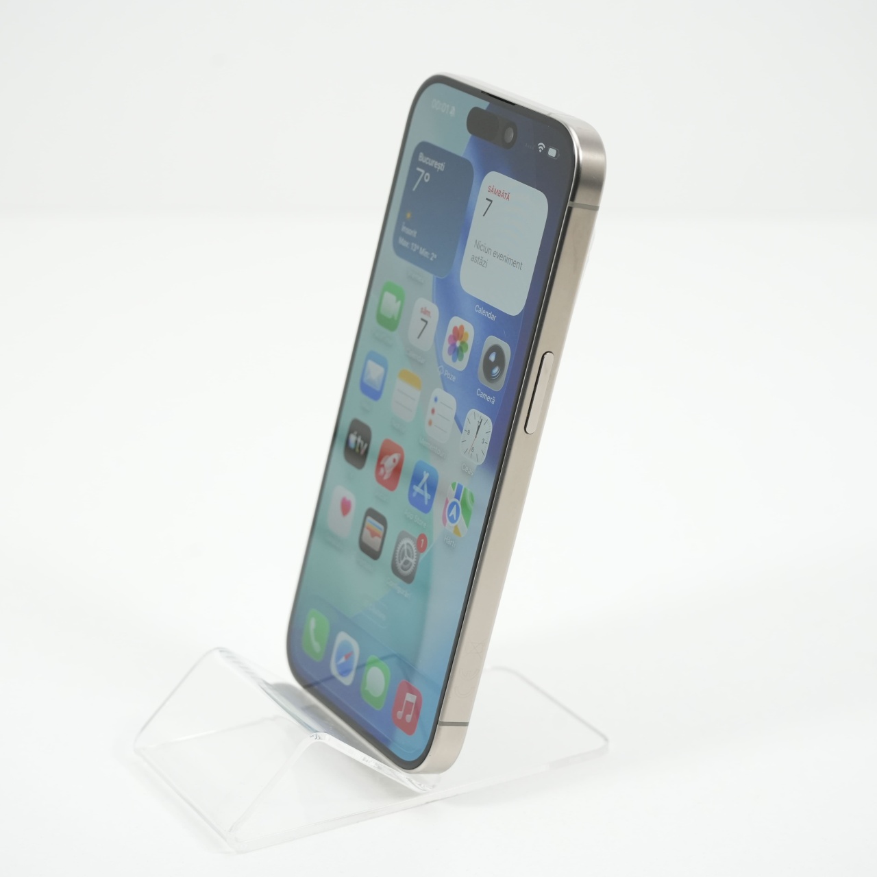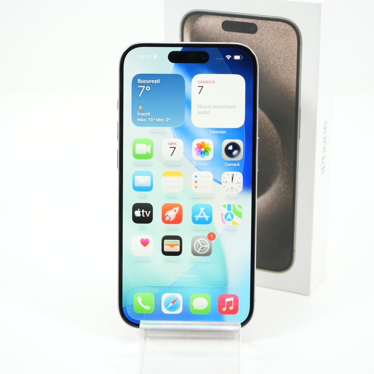 Ecran: 6.1, Refresh Rate 120 Hz Procesor: Apple A17 Pro Memorie RAM: 8GB Memorie interna: 256GB Camera Foto: Principala 48 MPx, Frontala 12 MPx Stare retea: Liber de rețea