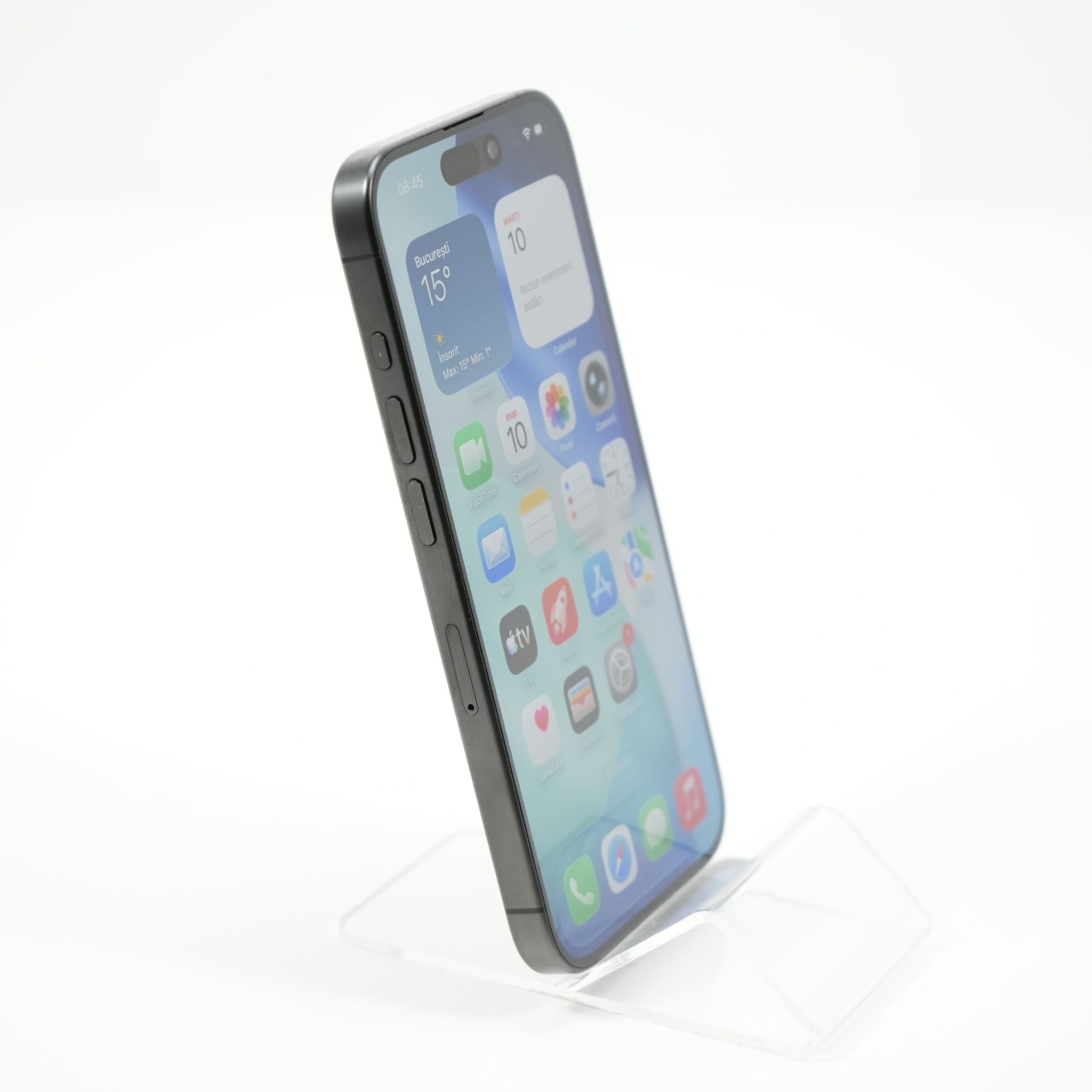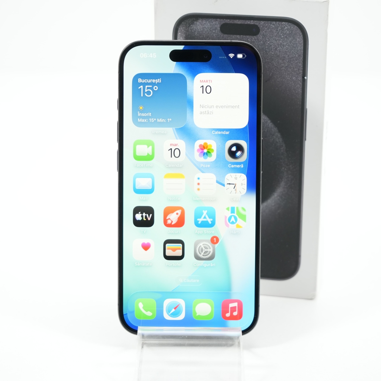 Ecran: 6.1, Refresh Rate 120 Hz Procesor: Apple A17 Pro Memorie RAM: 8GB Memorie interna: 256GB Camera Foto: Principala 48 MPx, Frontala 12 MPx Stare retea: Liber de rețea