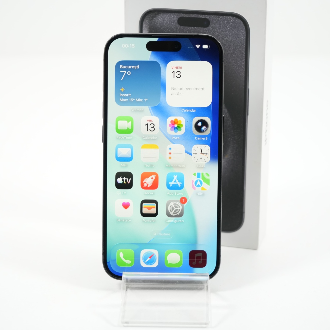 Ecran: 6.1, Refresh Rate 120 Hz Procesor: Apple A17 Pro Memorie RAM: 8GB Memorie interna: 256GB Camera Foto: Principala 48 MPx, Frontala 12 MPx Stare retea: Liber de rețea