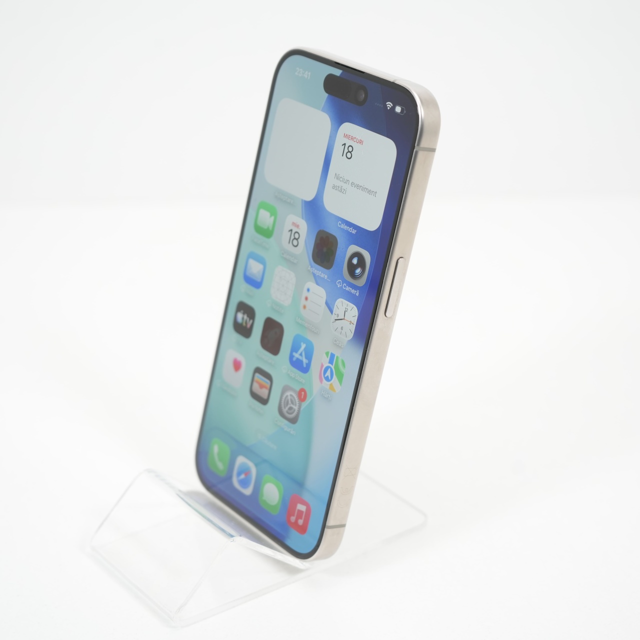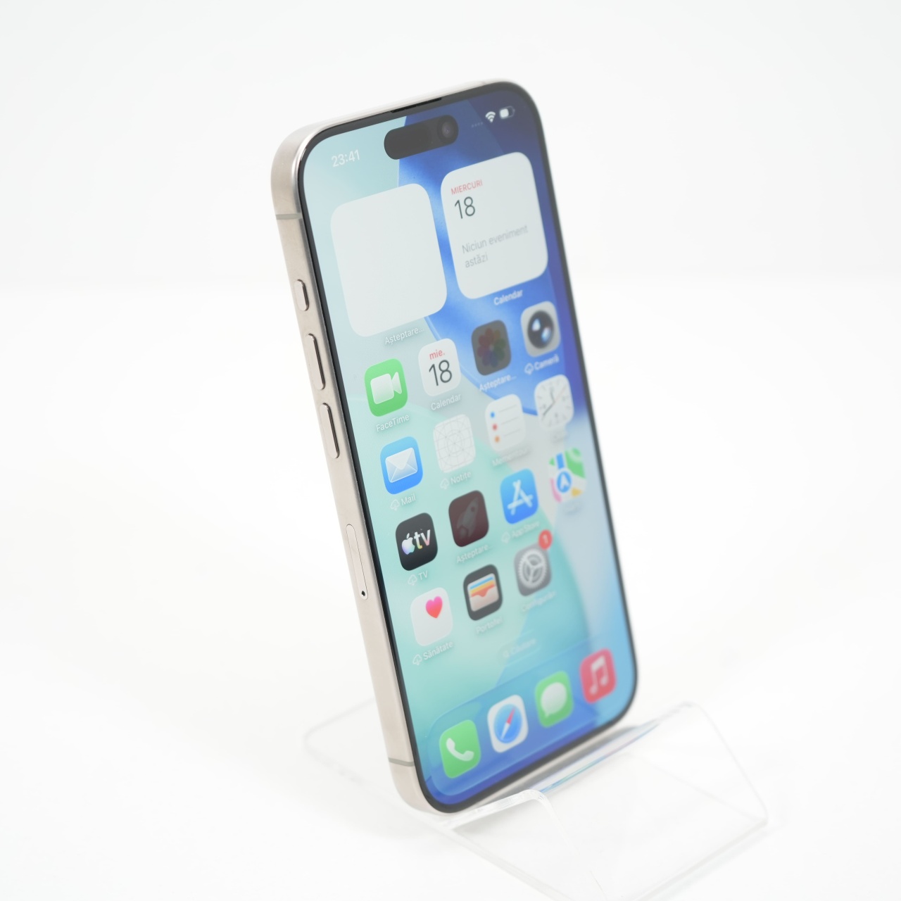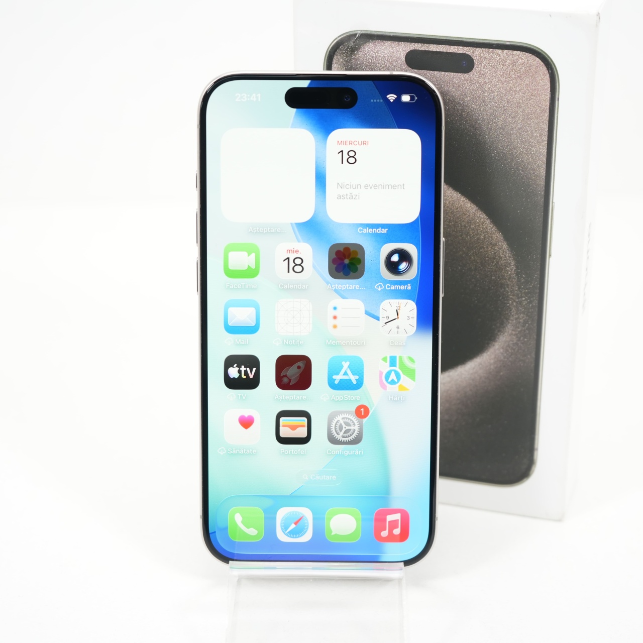 Ecran: 6.1, Refresh Rate 120 Hz Procesor: Apple A17 Pro Memorie RAM: 8GB Memorie interna: 256GB Camera Foto: Principala 48 MPx, Frontala 12 MPx Stare retea: Liber de rețea