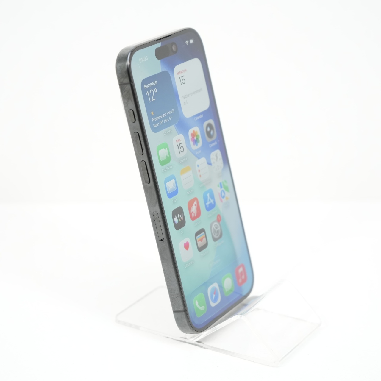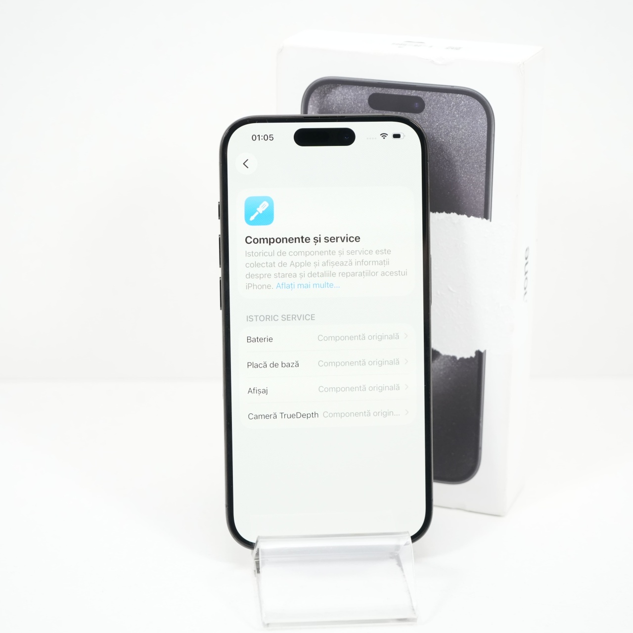 Ecran: 6.1, Refresh Rate 120 Hz Procesor: Apple A17 Pro Memorie RAM: 8 GB Memorie interna: 512GB Camera Foto: Principala 48 MPx, Frontala 12 MPx Stare retea: Liber de rețea Placa de baza, Afisaj, baterie si camera - schimbate componente originale