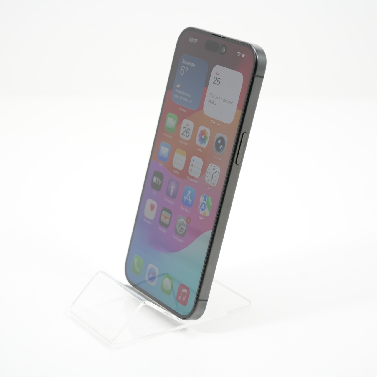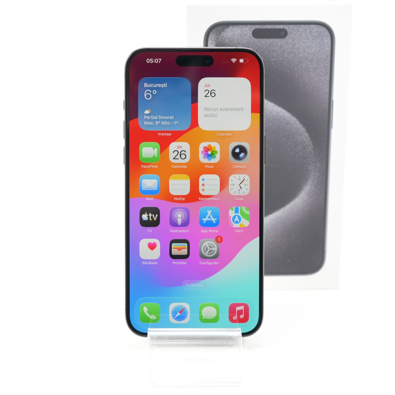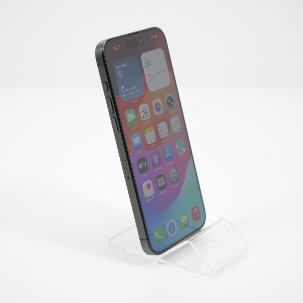 Ecran: 6.7, Refresh Rate 120 Hz Procesor: Apple A17 Pro Memorie RAM: 8GB Memorie interna: 256GB Camera foto: Principala 48 MPx, Frontala 12 MPx Stare retea: Liber de retea