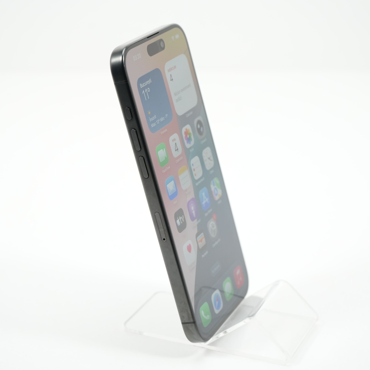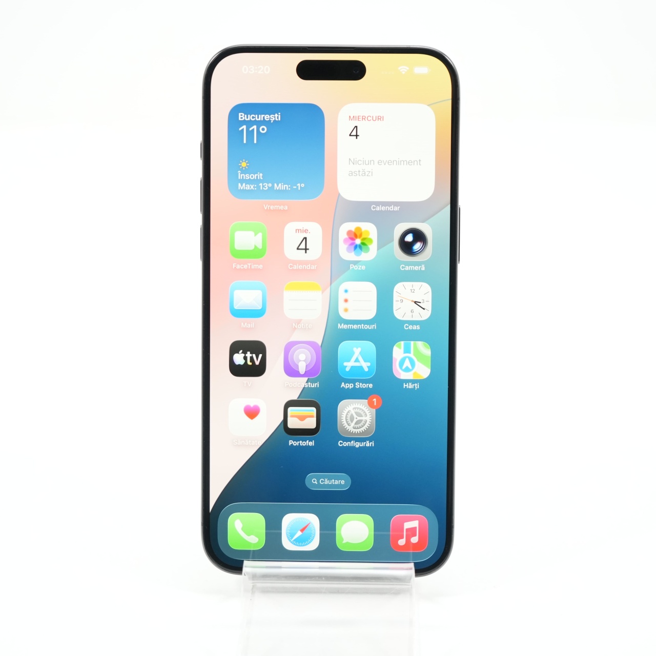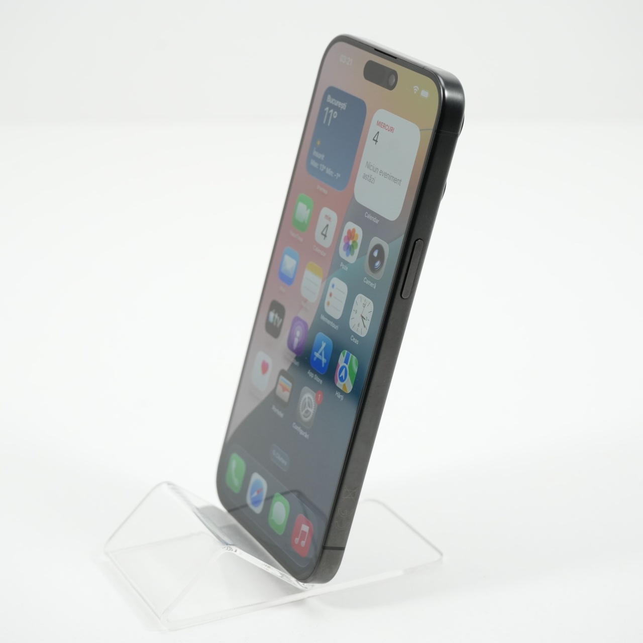 Ecran: 6.7, Refresh Rate 120 Hz Procesor: Apple A17 Pro Memorie RAM: 8 GB Memorie interna: 256GB Camera foto: Principala 48 MPx, Frontala 12 MPx Stare retea: Liber de rețea
