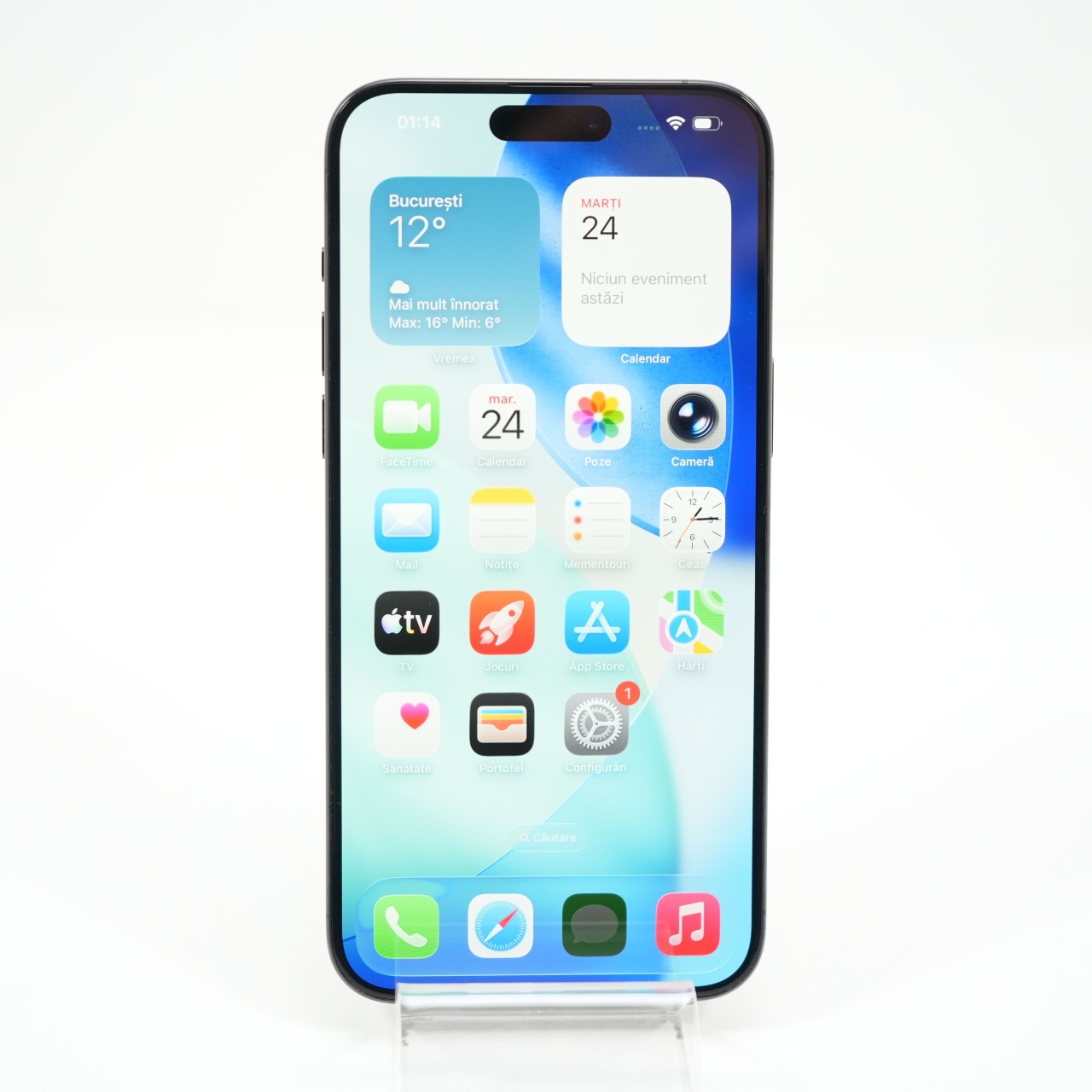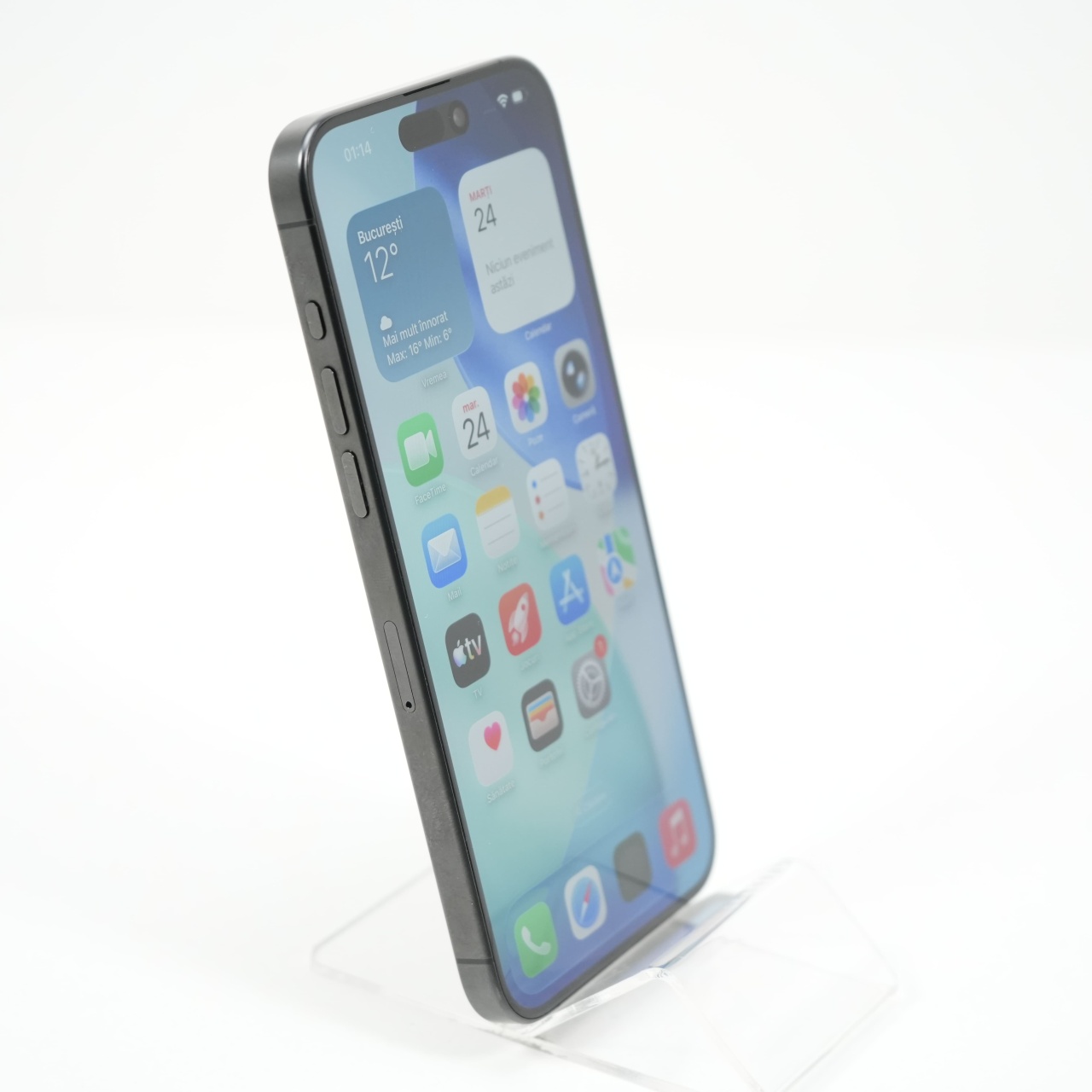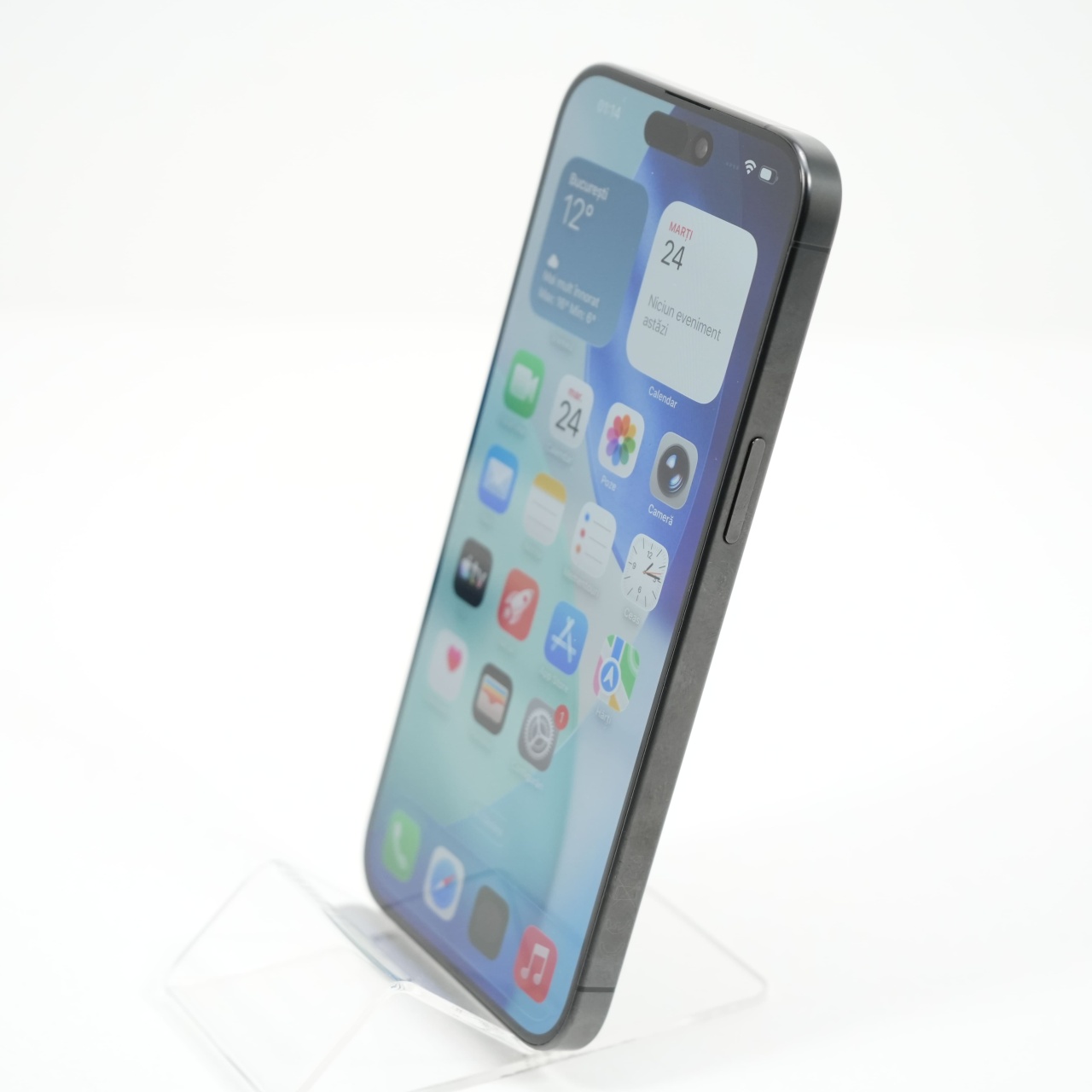 Ecran: 6.7, Refresh Rate 120 Hz Procesor: Apple A17 Pro Memorie RAM: 8 GB Memorie interna: 256GB Camera foto: Principala 48 MPx, Frontala 12 MPx Stare retea: Liber de rețea