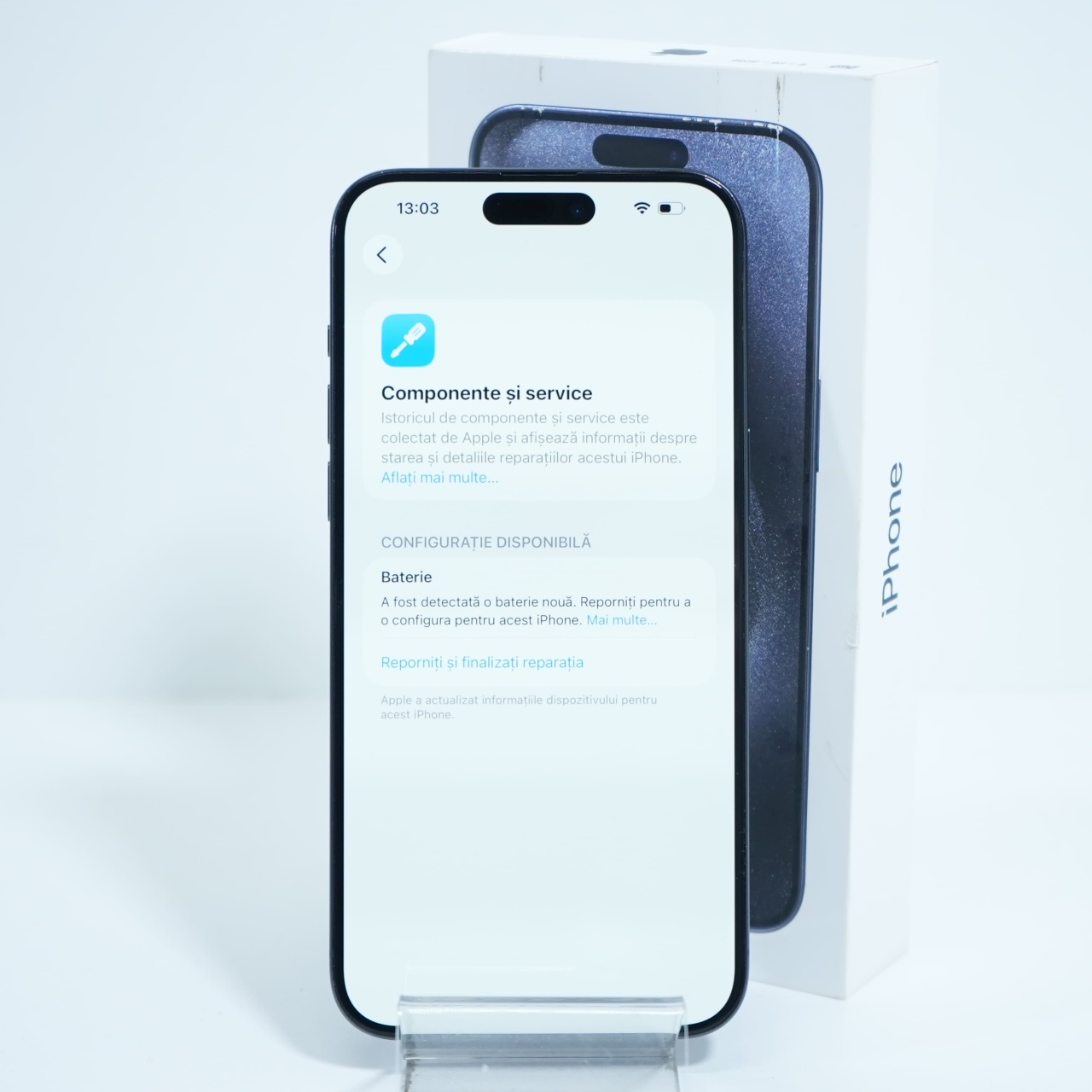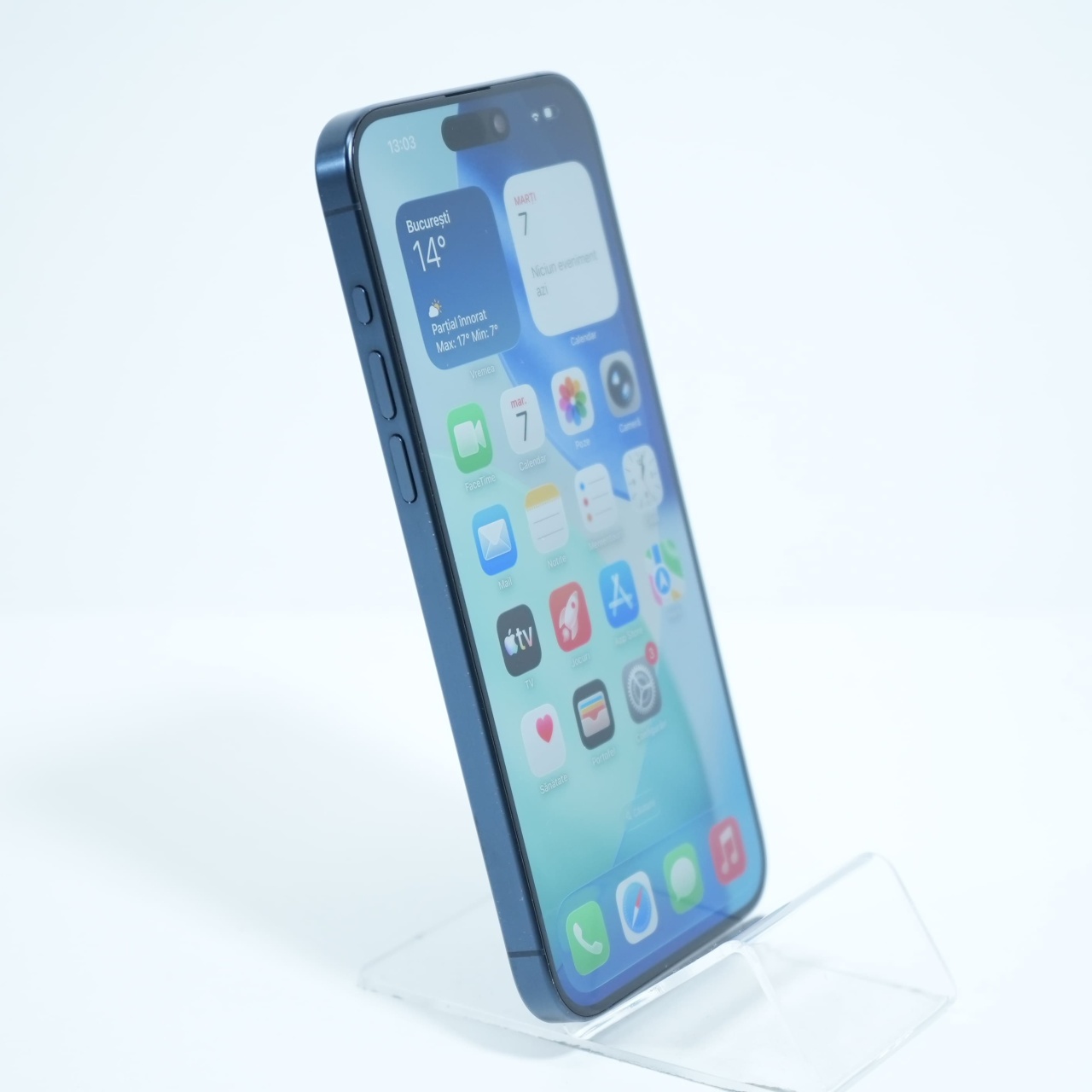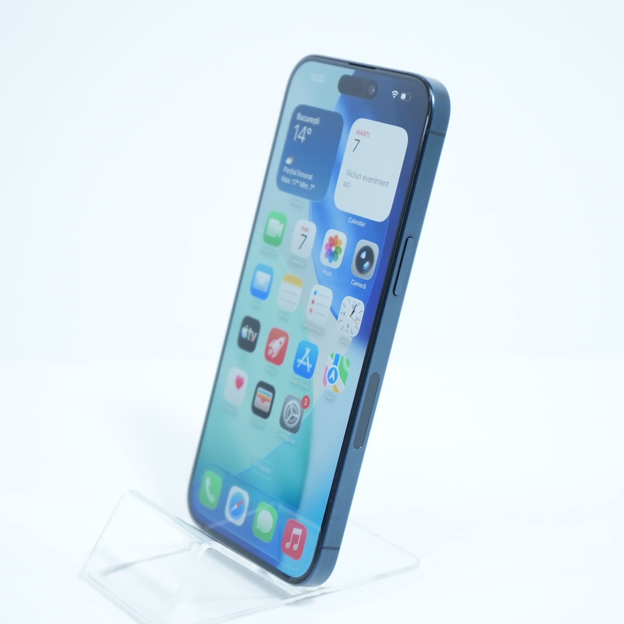 Ecran: 6.7, Refresh Rate 120 Hz Procesor: Apple A17 Pro Memorie RAM: 8GB Memorie interna: 256GB Camera foto: Principala 48 MPx, Frontala 12 MPx Stare retea: Doar e-SIM, Liber de rețea