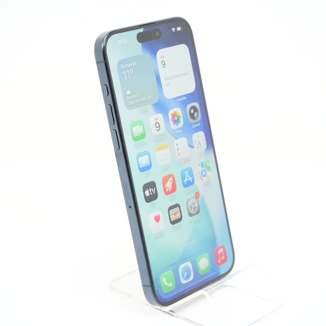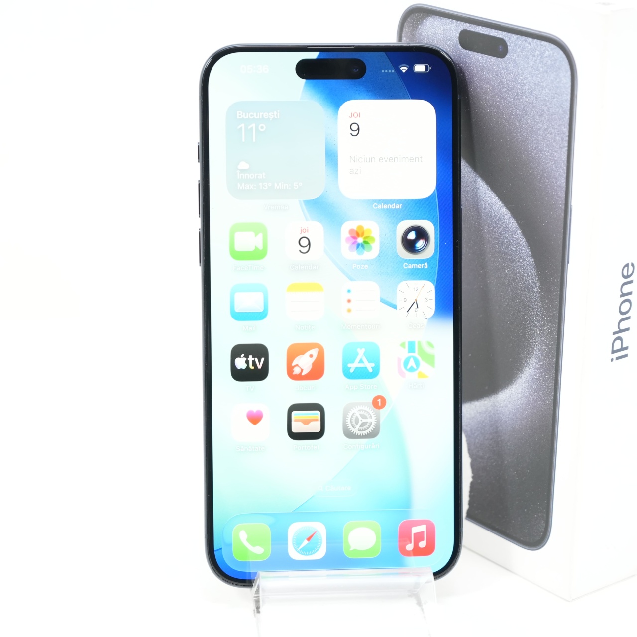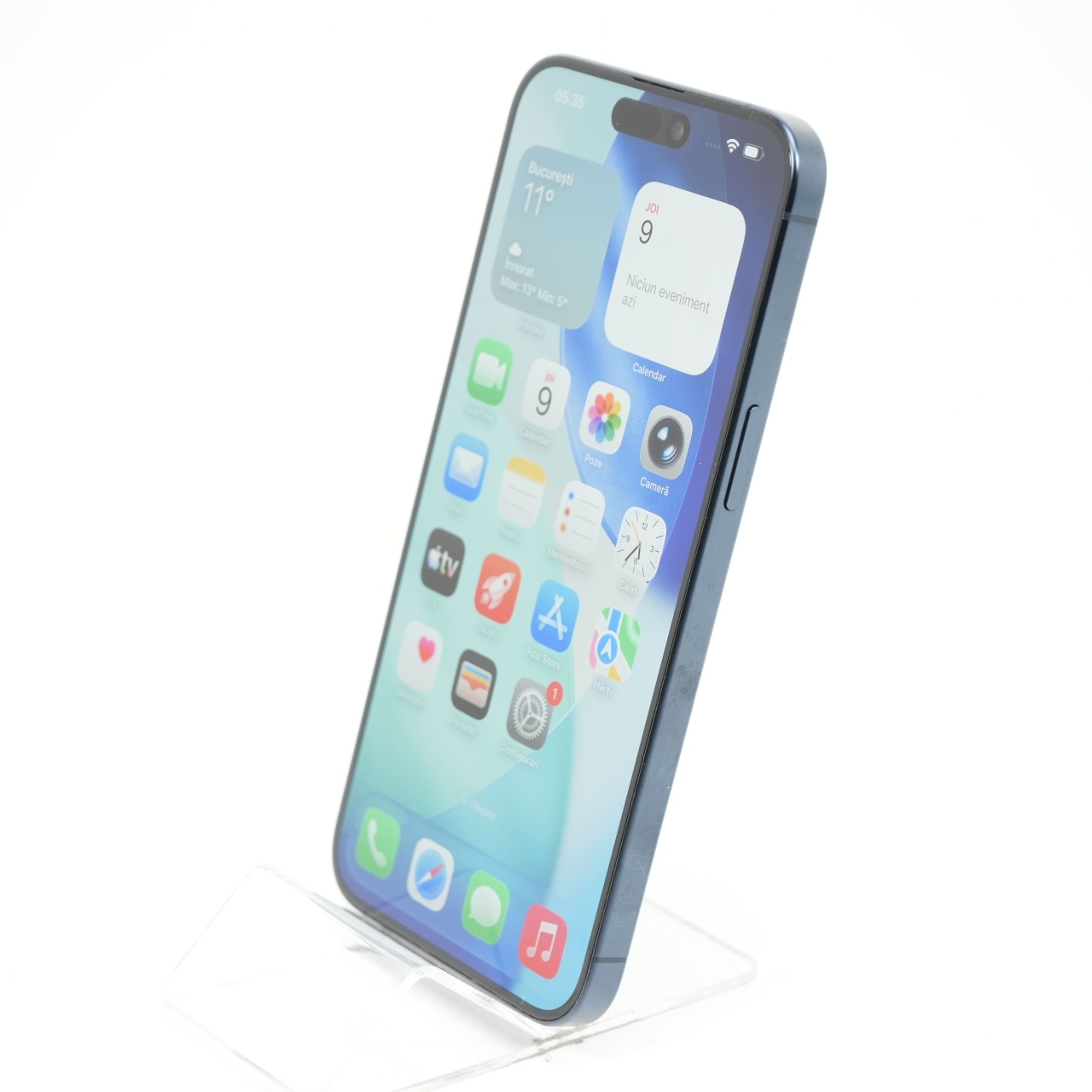 Ecran: 6.7, Refresh Rate 120 Hz Procesor: Apple A17 Pro Memorie RAM: 8GB Memorie interna: 256GB Camera foto: Principala 48 MPx, Frontala 12 MPx Stare retea: Liber de rețea