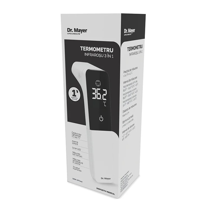 Termometru Infrarosu 3 in 1 Dr. Mayer - Utilizeaza tehnologia avansata cu infrarosu (IR) pentru a masura instantaneu si cu precizie temperatura corpului sau a unui obiect. Avantaje: Usor de utilizat si timp de masurare mai scurt. Este nevoie doar de 1 secunda pentru masurare si citirea valorii masurate. Pentru a garanta siguranta si igiena, acest termometru nu intra in contact cu corpul sau obiectele. Distanta de masurare este de 1 cm. Moduri pentru masurarea temperaturii corpului, masurarea la nivelul urechii si masurarea temperaturii obiectelor Acest termometru poate masura temperatura de la suprafata corpului, din canalul auricular si temperatura obiectelor. Intervalul de masurare in modul pentru masurarea temperaturii obiectelor este 0,0°C - 100,0°C. Acest lucru inseamna ca, in afara de temperatura suprafetei corpului si a canalului auricular, acesta poate masura temperatura de suprafata a obiectelorsi a lichidelor. Sunete de avertizare Functie de memorare. Stocheaza pâna la 20 de seturi de date recente de masurare. Oprire automata. Se opreste automat daca este lasat inactiv timp de 60±5secunde. Caracteristici: Afisaj digital LED Locul masurarii: Frunte, canal auricular si suprafata obiectelor Interval de masurare pentru modul de masurare la nivelul corpului/urechii: 32,0°C - 43,0°C; Interval de masurare pentru modul de masurare a temperaturii obiectelor: 0,0°C-100,0°C; Unitatea de masura pentru temperatura: °F/°C Rezolutie afisare temperatura: 0,1°F/0,1°C Precizie: ±0,4°F/±0,2°C Functia de memorare: Memorare 20 de seturi de valori masurate Functia de avertizare acustica (sau citire vocala): (1) La pornirea dispozitivului: 1 semnal sonor scurt (2) La finalizarea masurarii: 1 semnal sonor lung (3) Febra ≥99,5°F sau 37.5°C: 10 semnale sonore scurte (4) 3 semnale sonore scurte atunci cand sistemul nu functioneaza Sursa de alimentare: 3V DC, 2 baterii alcaline de 1,5V tip AAA (bateriile nu sunt incluse) Oprire automata: In 60±5s Greutatea unitatii principale: Aprox. 58 g (fara baterii) Dimensiunea unitatii principale: L 146mm x l 37mm x I 39mm Autonomie: Pot fi utilizate de 300 de ori in conditii normale Prezentare: Termometru Infrarosu 3 in 1 Dr. Mayer DRM-IRT102 – 1 bucata