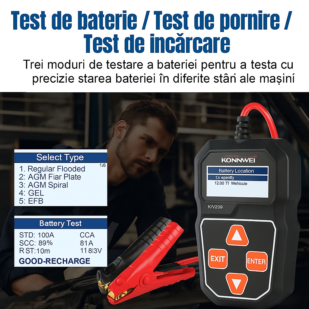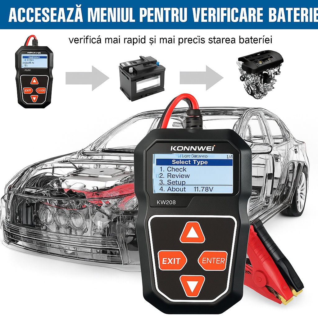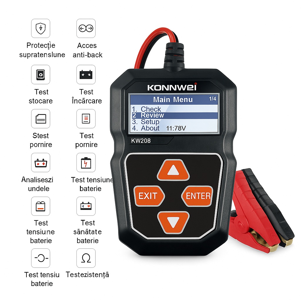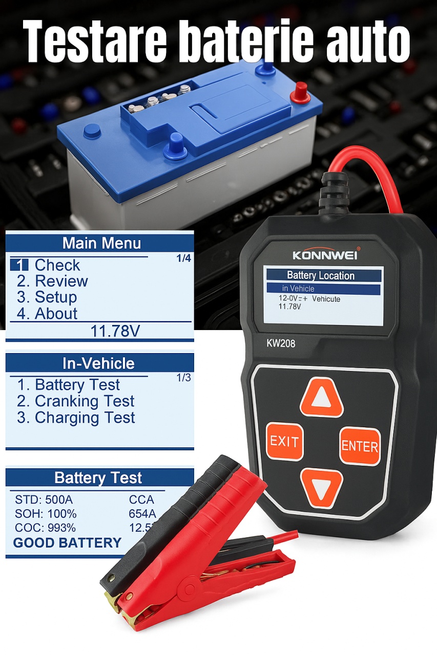 Tester de baterie auto KONNWEI KW208 – pentru diagnoza rapida si precisa a acumulatorilor 12V KONNWEI KW208 este un tester digital pentru baterii auto de 12V, conceput pentru a verifica starea de sanatate a bateriei, sistemul de pornire (cranking), alternatorul si sistemul de incarcare. Este ideal pentru ateliere auto, mecanici independenti, dar si pentru soferii care vor sa evite surprizele neplacute la drum. ✔ Compatibil cu multiple tipuri de baterii: baterii acide normale, AGM (flat plate si spiral), GEL, EFB si chiar LiFePO4 ✔ Teste efectuate: Test baterie (capacitate, CCA, SOH, SOC, rezistenta interna) Test pornire (cranking voltage & time) Test incarcare (alternator, dioda redresor, tensiune de incarcare) ✔ Detectare rapida a defectelor comune din sistemul de pornire si incarcare, cu instructiuni clare pe ecran Detalii tehnice: Tensiune de lucru: DC 9V–16V Dimensiuni: 12.2 cm x 8 cm x 1.5 cm Ecran LCD alb-negru de 2.0 inch Interfata usor de utilizat, cu butoane pentru navigare rapida Limbi disponibile: Engleza, Germana, Franceza, Spaniola, Italiana, Portugheza, Rusa, Olandeza (suporta si altele la cerere) Utilizare intuitiva: Conectezi clemele la bornele bateriei Alegi tipul bateriei si standardul de masurare (CCA, DIN, IEC etc.) Efectuezi testul si vezi instant rezultatele: starea bateriei, recomandari (de ex. GOOD-RECHARGE) Ideal pentru autoturisme, camionete, motociclete sau barci echipate cu baterii de 12V.
