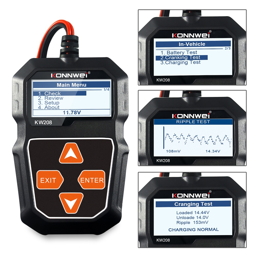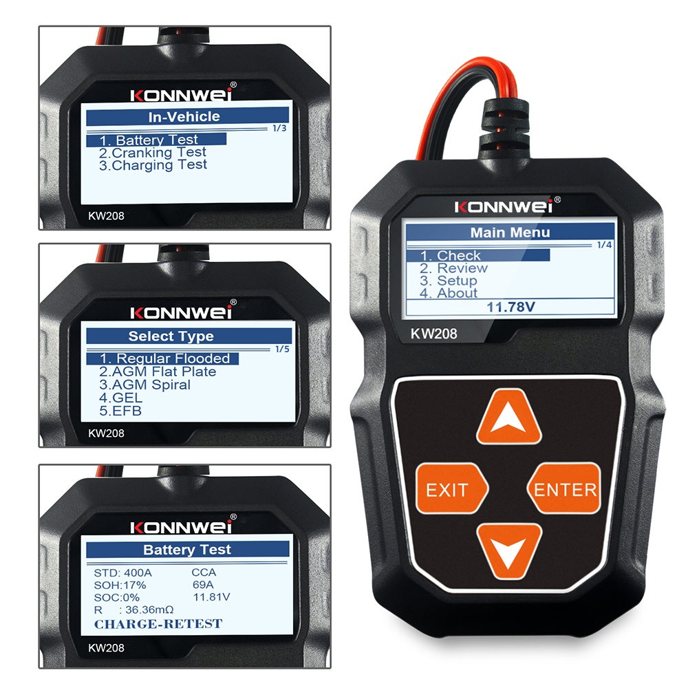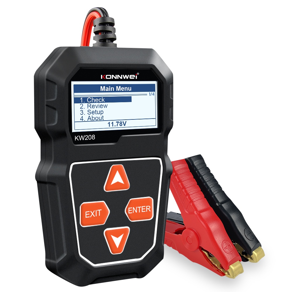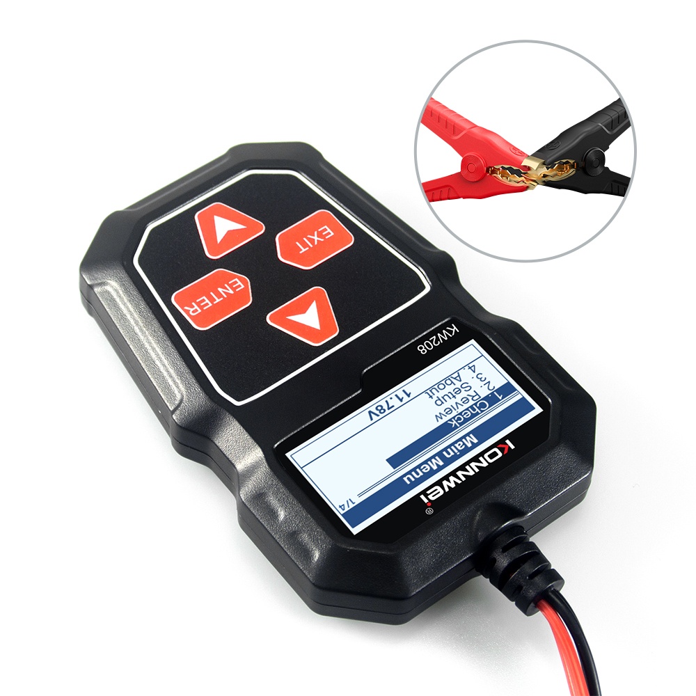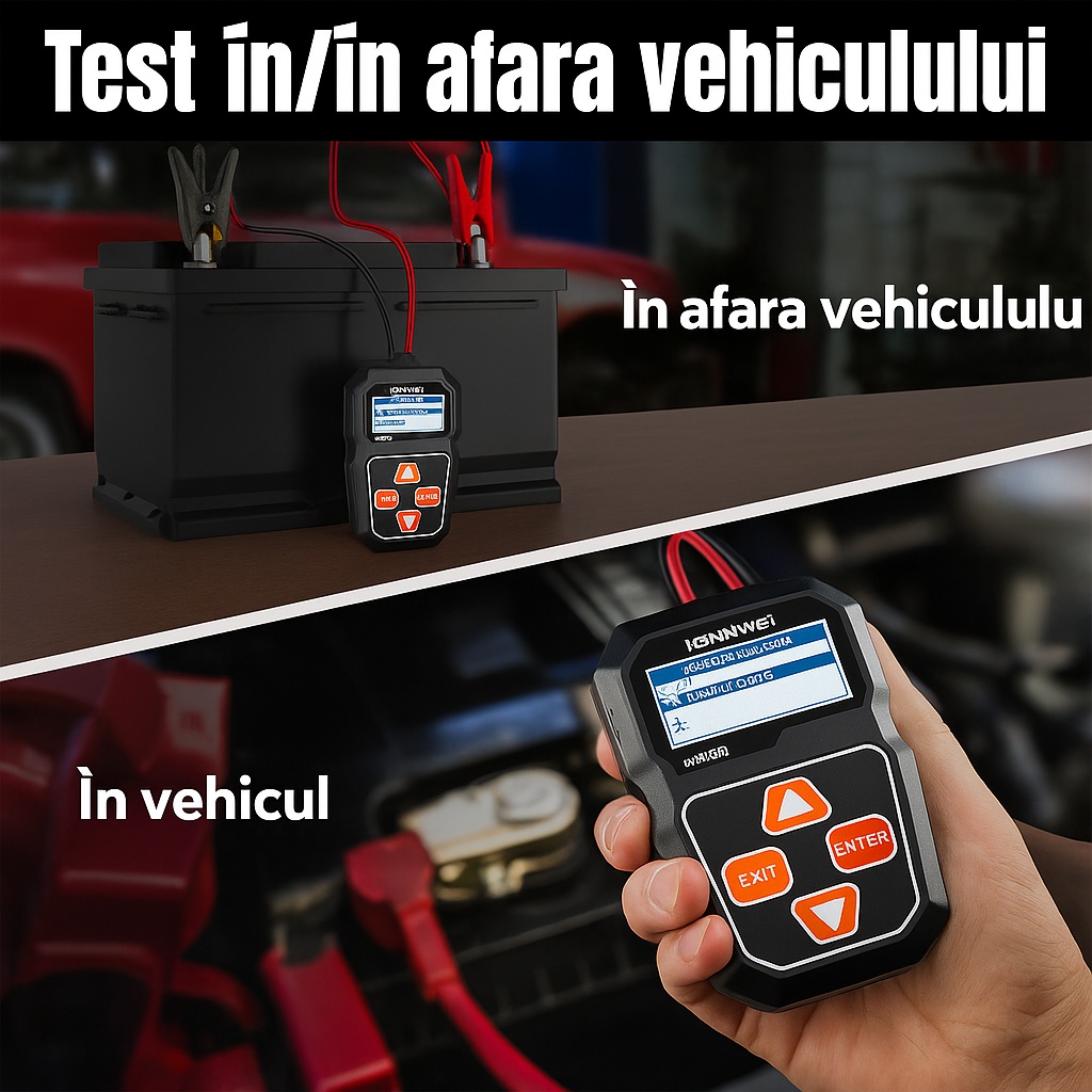 Tester de baterie auto KONNWEI KW208 – pentru diagnoza rapida si precisa a acumulatorilor 12V KONNWEI KW208 este un tester digital pentru baterii auto de 12V, conceput pentru a verifica starea de sanatate a bateriei, sistemul de pornire (cranking), alternatorul si sistemul de incarcare. Este ideal pentru ateliere auto, mecanici independenti, dar si pentru soferii care vor sa evite surprizele neplacute la drum. ✔ Compatibil cu multiple tipuri de baterii: baterii acide normale, AGM (flat plate si spiral), GEL, EFB si chiar LiFePO4 ✔ Teste efectuate: Test baterie (capacitate, CCA, SOH, SOC, rezistenta interna) Test pornire (cranking voltage & time) Test incarcare (alternator, dioda redresor, tensiune de incarcare) ✔ Detectare rapida a defectelor comune din sistemul de pornire si incarcare, cu instructiuni clare pe ecran Detalii tehnice: Tensiune de lucru: DC 9V–16V Dimensiuni: 12.2 cm x 8 cm x 1.5 cm Ecran LCD alb-negru de 2.0 inch Interfata usor de utilizat, cu butoane pentru navigare rapida Limbi disponibile: Engleza, Germana, Franceza, Spaniola, Italiana, Portugheza, Rusa, Olandeza (suporta si altele la cerere) Utilizare intuitiva: Conectezi clemele la bornele bateriei Alegi tipul bateriei si standardul de masurare (CCA, DIN, IEC etc.) Efectuezi testul si vezi instant rezultatele: starea bateriei, recomandari (de ex. GOOD-RECHARGE) Ideal pentru autoturisme, camionete, motociclete sau barci echipate cu baterii de 12V.
