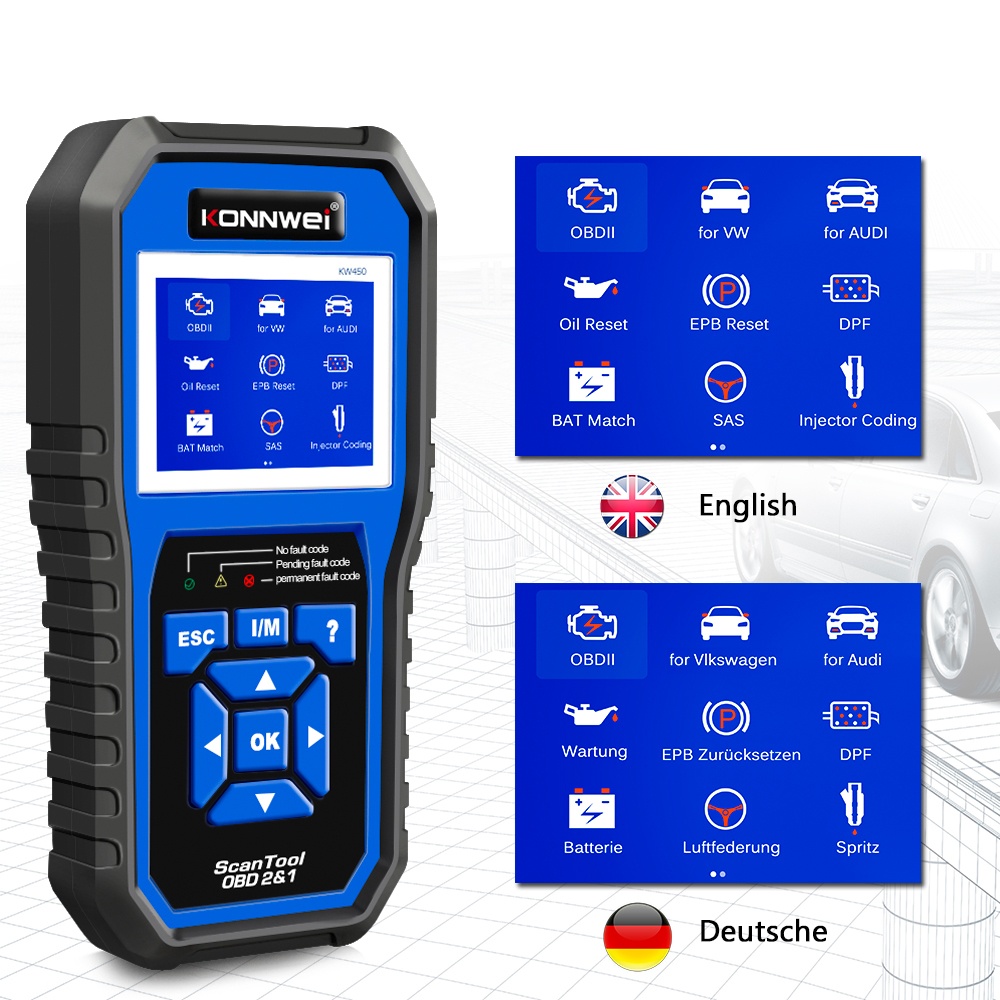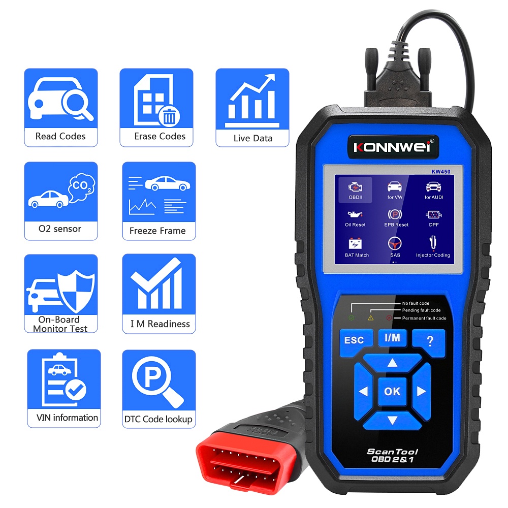 Testerul auto KONNWEI KW450 este un dispozitiv profesional de diagnoza OBD2 conceput pentru a citi, sterge si analiza codurile de eroare ale vehiculelor compatibile OBDII (benzina din 2001+, diesel din 2004+), precum si pentru diagnoza completa a sistemelor la modelele VW, Audi, Skoda si Seat . Ideal pentru ateliere auto, electricieni si pasionati care vor o unealta fiabila, rapida si usor de folosit. ⚙️ Functii OBDII universale Read Codes / Erase Codes – citirea si stergerea codurilor de eroare din ECU motorului Live Data – afiseaza in timp real parametrii motorului (turatie, temperatura, debit aer, tensiune etc.) Freeze Frame – salveaza datele motorului la momentul aparitiei erorii I/M Readiness – verifica starea sistemelor de emisii pentru ITP O2 Sensor Test – testeaza senzorii de oxigen (lambda) On-Board Monitor Test – verifica functionarea catalizatorului, EGR, EVAP etc. VIN Information – identifica automat vehiculul dupa numarul VIN DTC Lookup – dictionar intern de coduri de eroare (explica semnificatia codurilor) ? 9 Functii speciale pentru VAG (VW / Audi / Skoda / Seat) Oil Service Reset – resetare interval schimb ulei EPB Reset – resetare frana de parcare electrica Battery Matching (BAT Match) – inregistrare baterie noua in ECU DPF Regeneration – regenerare filtru de particule diesel SAS Calibration – calibrare senzor unghi volan TPS Reset – resetare senzor pozitie clapeta acceleratie Injector Coding – codare injectoare dupa inlocuire Suspension Adjustment – reglaj suspensie electronica Lamp Adjust – reglaj sistem iluminare faruri ? Diagnoza completa pe sistemele VAG Compatibil cu toate modulele principale: Motor, transmisie, ABS, airbag, directie, climatizare, radio, imobilizator, instrumente bord etc. Functii: System Scan , Gateway Scan , Control Unit Access , afisare coduri + stergere + fluxuri de date. ? Compatibilitate vehicule Marca Compatibilitate VW modele din 2003+ (Golf, Passat, Polo, Tiguan, Touareg, Jetta etc.) Audi modele din 2004+ (A3, A4, A5, A6, Q3, Q5, Q7, TT etc.) Skoda modele din 2006+ (Octavia, Superb, Yeti, Kodiaq, Rapid, Fabia) Seat modele pana in 2010 (Leon, Ibiza, Toledo, Altea etc.) ?️ Specificatii tehnice Ecran color TFT de 2.8 Limba meniu: Engleza, Germana Alimentare directa prin port OBDII (nu necesita baterii) Update firmware prin cablu USB (inclus) Suport protocoale OBDII: CAN, ISO9141, KWP2000, J1850 PWM/VPW Dimensiuni: 20.3 × 10.2 × 3.5 cm Greutate: 0.45 kg ? Pachetul contine Tester auto KONNWEI KW450 Cablu OBD2 Cablu USB pentru actualizare Manual de utilizare (EN+Romana) Husa de transport Cutie originala KONNWEI ✅ Avantaje Compatibilitate completa OBD2 + VAG Constructie robusta, design ergonomic Nu necesita laptop sau software suplimentar Actualizari gratuite de firmware Ideal pentru diagnoza rapida si intretinere preventiva KONNWEI KW450 combina functiile unui tester universal cu instrumente avansate dedicate grupului VAG, oferind o solutie completa pentru diagnoza si resetarea vehiculelor europene.