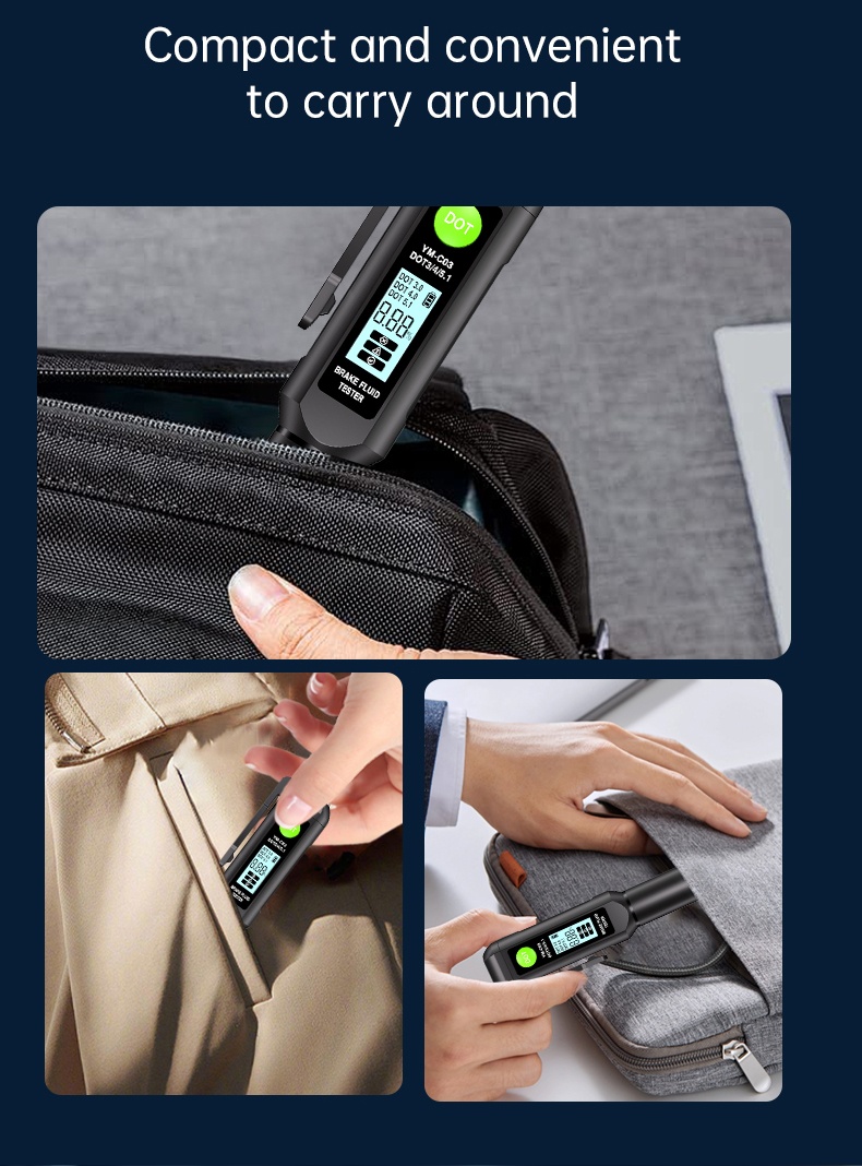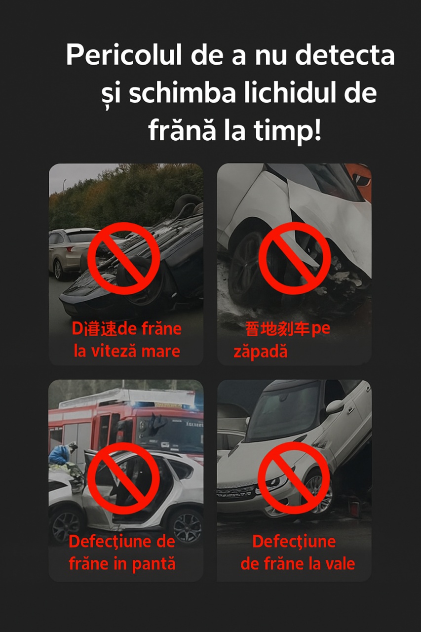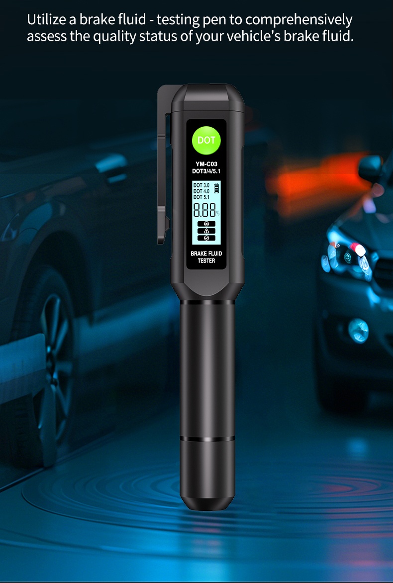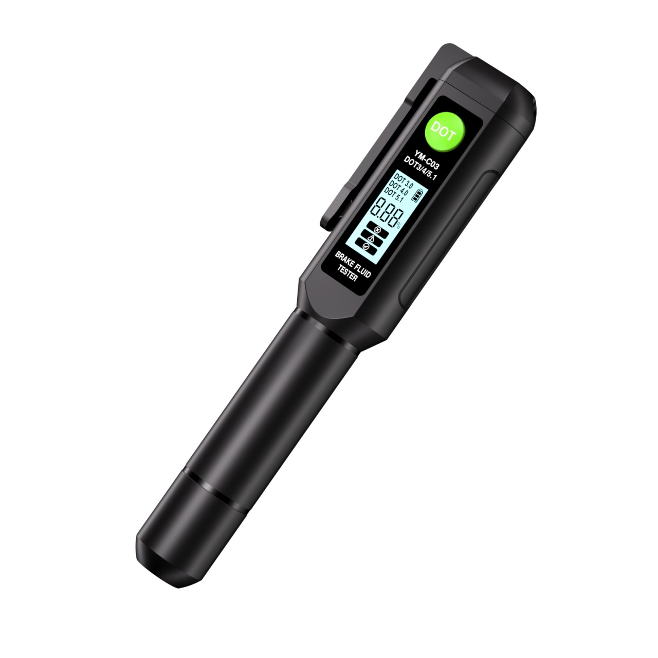 Testerul digital de lichid de frana Techstar® YM-C03 este un dispozitiv inteligent pentru verificarea rapida si precisa a nivelului de apa din lichidul de frana. Ideal pentru ateliere auto si utilizatori casnici, acest tester este compatibil cu lichidele DOT3, DOT4 si DOT5.1 si ofera rezultate clare pe un ecran HTN iluminat cu coduri de culoare. ✅ Masoara continutul de apa din lichidul de frana (verde <1.5%, galben <3%, rosu 3–4%) ✅ Afisaj LCD de 0.96 inch cu unghi larg si contrast ridicat ✅ Senzor de precizie si alerta sonora pentru siguranta maxima ✅ Functie sleep automata dupa 1 minut pentru economie de baterie ✅ Compact, usor si portabil – functioneaza cu o singura baterie AAA ✅ Recomandat pentru masini, motociclete, SUV-uri, camioane Dimensiuni: 155 x 30 x 25 mm Greutate: 38.5g Tensiune de lucru: 1–1.5V Consum standby: 22uA Interval de temperatura: 0–50°C Asigura-te ca sistemul tau de franare este in conditii optime cu acest tester precis si usor de utilizat!