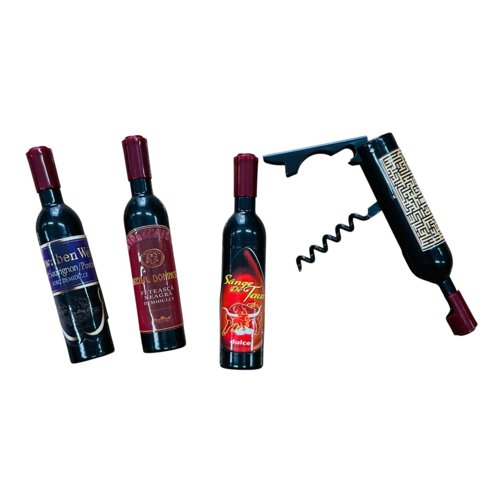Tirbusonul in forma de sticla de vin, cu o inaltime de 12 cm, este un accesoriu practic si amuzant pentru orice iubitor de vin. Disponibil in mai multe modele combinate, fiecare piesa imita fidel o sticla de vin, iar in interior ascunde un desfacator metalic rezistent si o spirala eficienta pentru dopuri de pluta. Compact si usor de folosit, este perfect pentru acasa, picnic, bar, dar si ca idee de cadou ingenios. Se livreaza aleatoriu in functie de stocul disponibil.