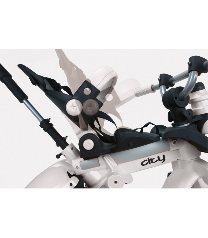 Tricicleta pentru copii Injusa City Max Alb Negru cu pozitie de somn, maner parental reglabil, cadru din aluminiu, accesorii incluse, roti spuma Eva, cadru aluminiu, greutate admisa 25 kg, 8 luni+