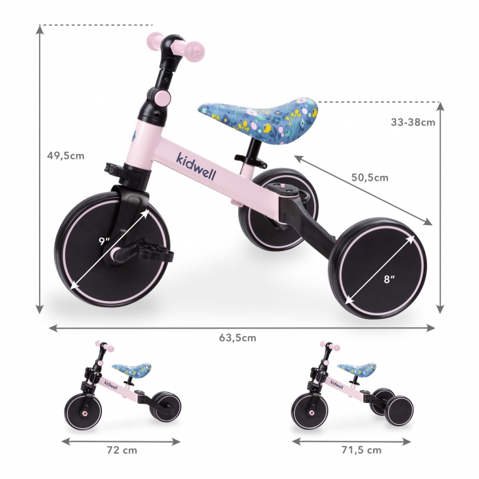 Tricicleta pentru copii Kidwell Pico Spring Flower, cu pedale, 3 in 1 , scaun reglabil pe inaltime, reglarea in 3 trepte a distantei dintre ghidon si copil, potrivita pentru inaltimea unui copil 90 - 124 cm