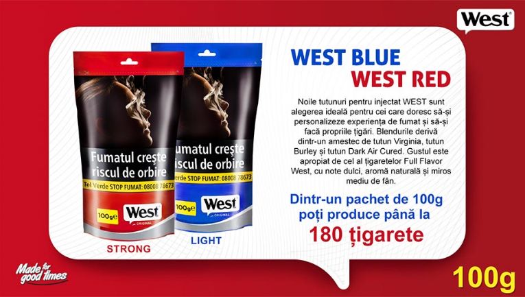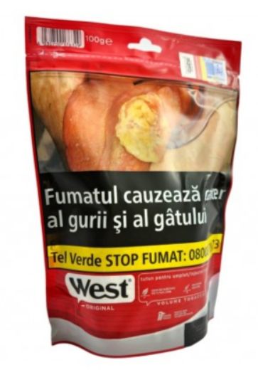 Descriere tutun West Red 100g/nPachetul contine 100g tutun firicel de calitate superioara destinat injectarii in tuburi de tigari./nAmestec tutun: Full Flavour FMC - Virginia, Burley si tutun Dark Air Cured/nTarie: mediu spre tare/nGramaj: 100g/nPunga resigilabila cu sistem Zip Lock pentru pastrarea umiditatii si a prospetimii tutunului./nAcest produs se adreseaza exclusiv persoanelor cu varsta de peste 18 ani !/nDirectiva Consiliului CE 89/662/CEE/nTutunul dauneaza grav sanatatii dumneavoastra si a celor din jur./nProducator: Imperial Tobacco