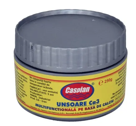 Vaselina Caspian CA3 500g Vaselina auto obtinuta din uleiuri cu un grad ridicat de rafinare. Este livrata cu aditivi de presiune extrema speciali inclusi, care îi confera proprietati antiuzura excelente, precum si o capacitate extraordinara de a functiona la temperaturi ridicate. Utilizari recomandate: Special recomandat în lubrifierea mecanismelor expuse alunecarii, încarcaturilor foarte mari si perioadelor lungi de lubrifiere. Lubrifierea lagarelor de alunecare, pivotului ciocanului hidraulic, angrenajelor descoperite si rotilor de rezerva. Principalele calitati: Ofera siguranta suplimentara pentru punctele în care exista dificultati în lubrifiere sau în care în timpul functionarii echipamentului pot aparea conditii extreme. Caracteristici excelente de presiune extrema. Protectie buna împotriva oxidarii, coroziunii si ruginirii.