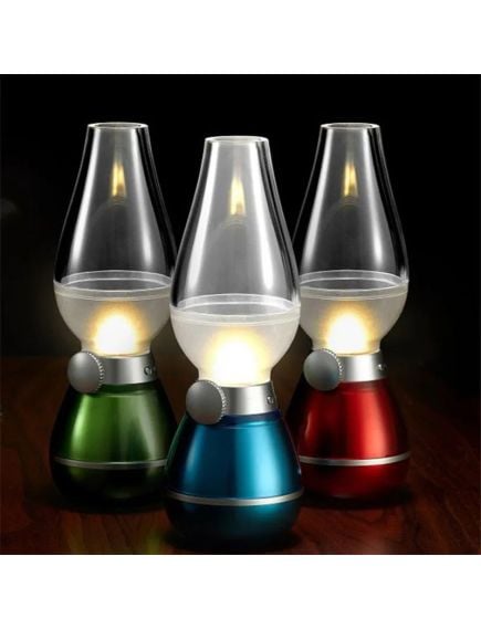 Lampa retro cu 3 LEDuri.produs inovator care va va satisface prin design si capacitatea de economisire a energiei.Aspect retro, cu baterie incorporata, reincarcabila prin cablu USB.Puteti controla intensitatea luminoasa prin rotita situata in zona mediana.Poate fi oprita sau pornita doar prin suflare in abajur sau prin atingerea acestuia.Becurile LED au o viata de aproximativ 6000 de ore.