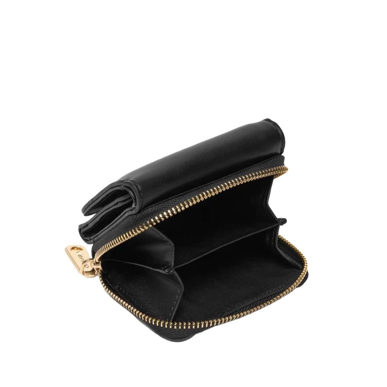 Portofelul Valentino West Re Wallet Nero este o reinterpretare elegantă a unui clasic modern. Realizat din piele naturală fină, prezintă un design compact și structurat, accentuat de detaliile metalice aurii și de logo-ul Valentino amplasat pe partea frontală. Interiorul dispune de compartimente organizate pentru carduri, bancnote și monede, iar fermoarul lateral adaugă un plus de siguranță și funcționalitate.