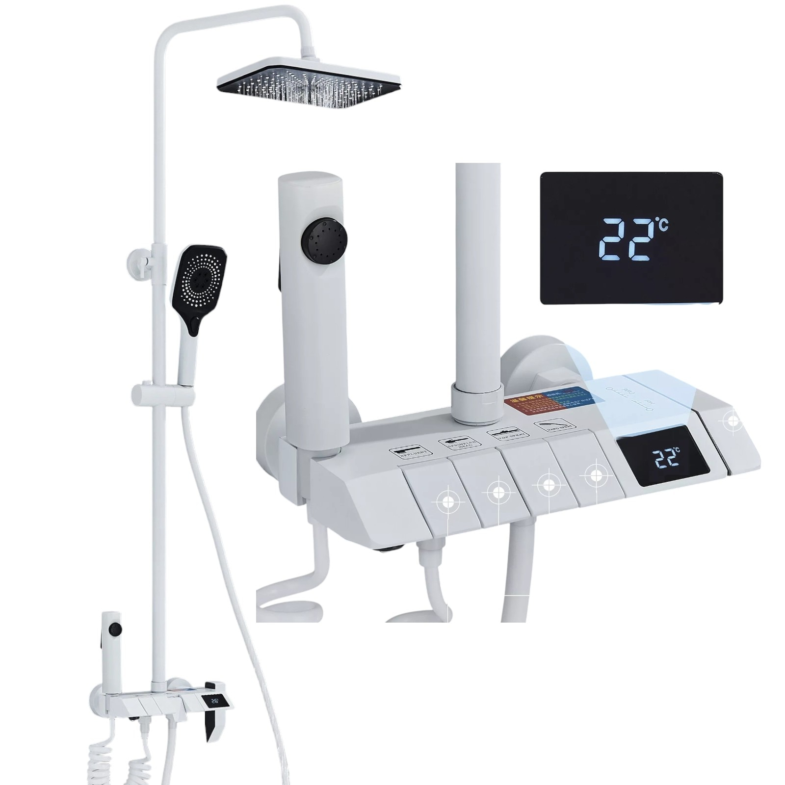 Coloana de Dus Baie BisDesign , Afisaj LCD Temperatura Apa, Butoane Stil Piano, Finisaj Alb Mat, Para Dus 28 cm cu Efect Ploaie, 4 Functii de Curgere