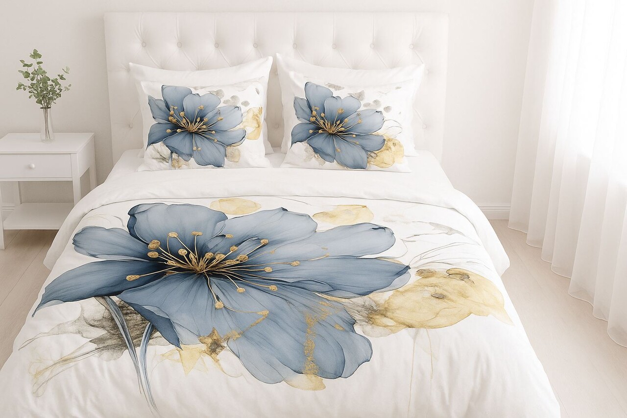 Lenjerie de pat dubla Super King (EU) (IT), 3 piese, Lessentiel Maison, Flora, Bumbac;Poliester, Alb / Albastru / Auriu